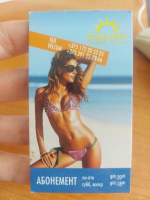 - Студия загара "Sunlight" временно не будет работать по воскресеньям. Приносим извинения за неудобства. Ждём Вас: пн-пт 9:00-20.00, сб: 9:00-18:00 (тех. перерыв: 14:00-14:30)