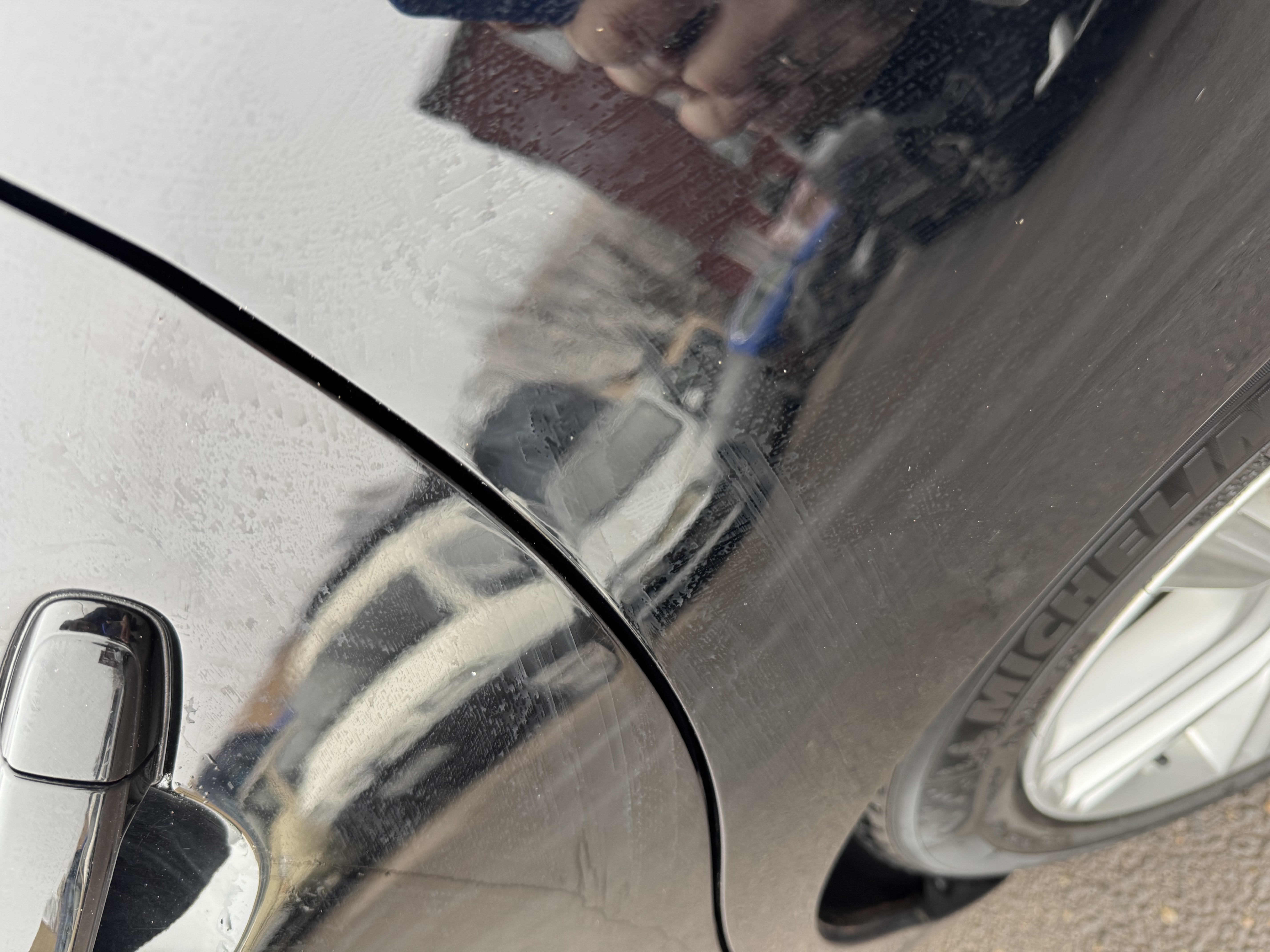До кучи, помыли на «троечку» - куча разводов с грязью на кузове, см. пример на фото - явно вытирали кузов на сухо грязной тряпкой, на черном все очень даже заметно.