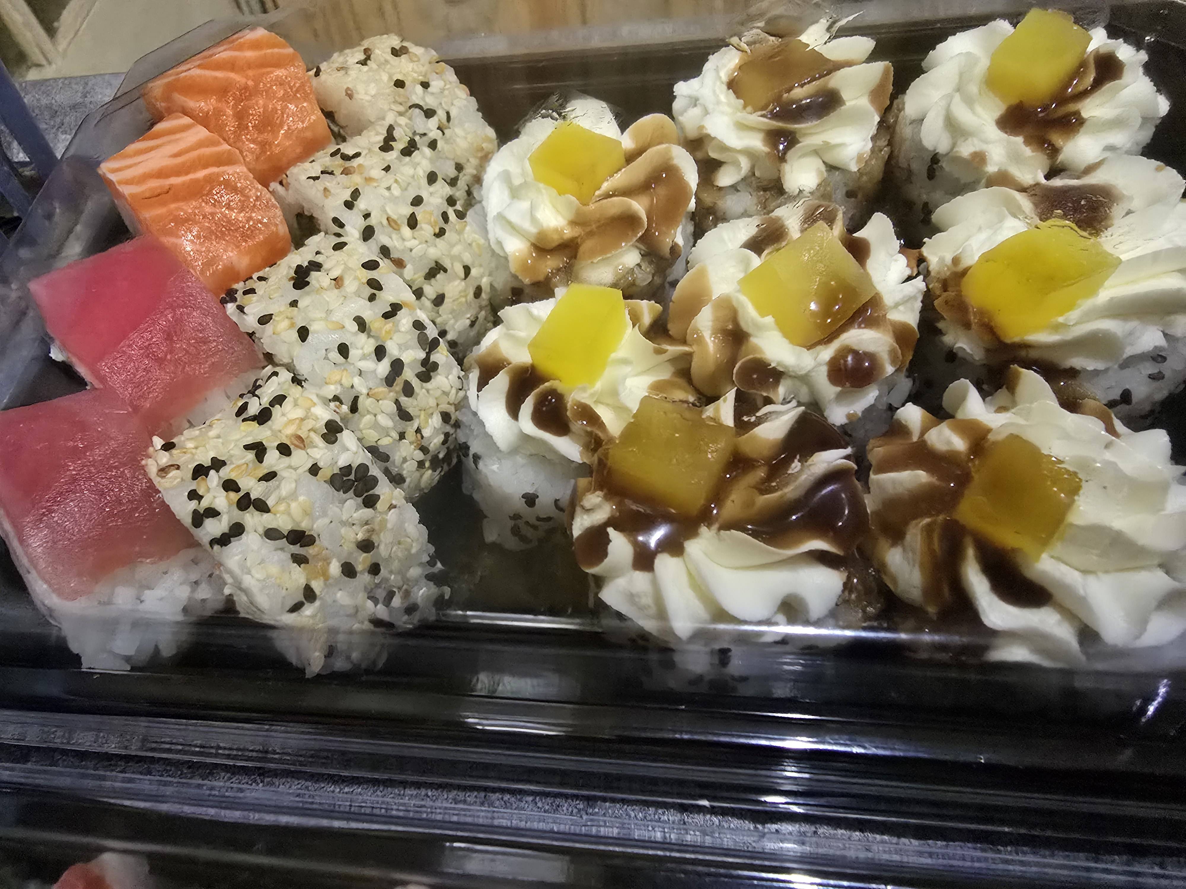 Часто тут заказывали, и в основном берём сет «Ирония судьбы», и сегодня его заказали; но привезли Филадельфию с твердым, зеленым и кислым манго. Можно же позвонить и предложить не добавлять его или на огурец заменить. Есть в итоге невозможно.