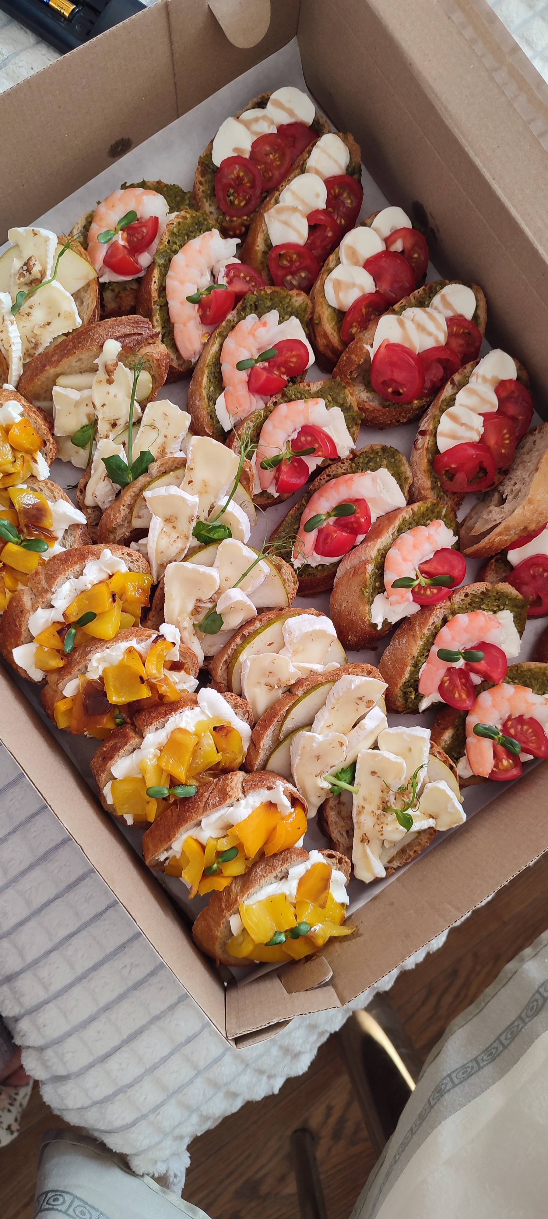 - бокс "Изысканность" (32 шт, 1600 г): брускетты с креветкой, сливочным сыром и песто, с сыром "Бри" и грушей, с сыром фета и печеным перцем, с моцареллой, черри и песто