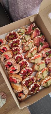 - бокс "Кростини" (24 шт, 840 г): кростини с пряной мидией и муссом с вялеными томатами, с королевской креветкой и муссом песто, со сливочным сыром и салями, с прошутто, виноградом и сливочным муссом