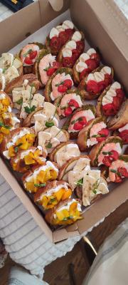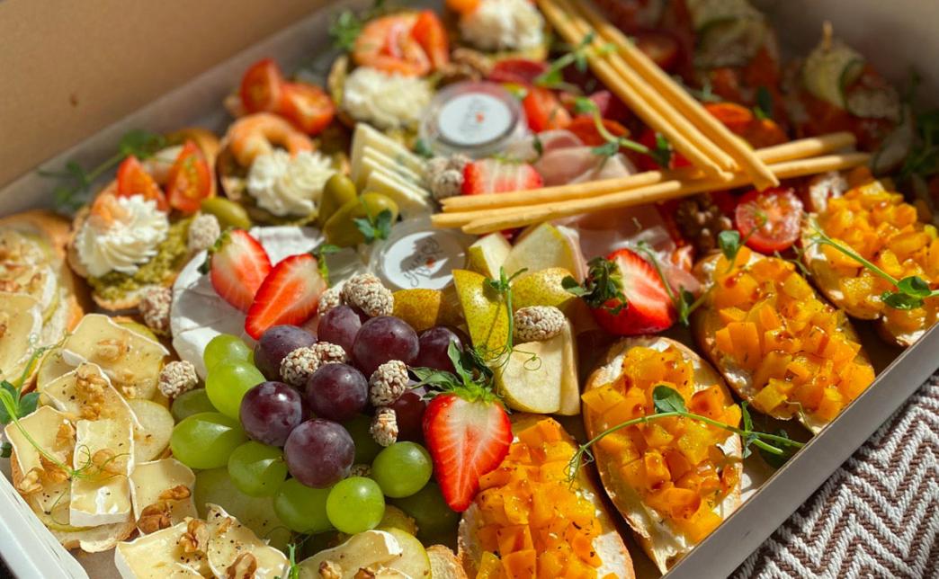 - бокс "Канапе" (30 шт, 700 г): рулетик с салями, сливочным сыром, огурцом, "капрезе" на тосте с песто, салями с сыром и огурцом на чесночном тосте, запеченный сыр бри с медом, грецким орехом и виноградом на чесночном тосте, рулетик с карбонадом и сырно-чесночной намазкой