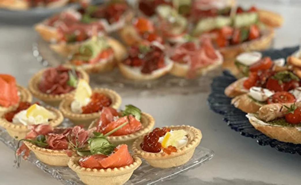 - бокс "Тарталетки" (24 шт, 1200 г): тарталетки с лососем и сливочным сыром, с прошутто и грушевым чатни, с икрой и сливочным муссом, с тигровой креветкой и песто