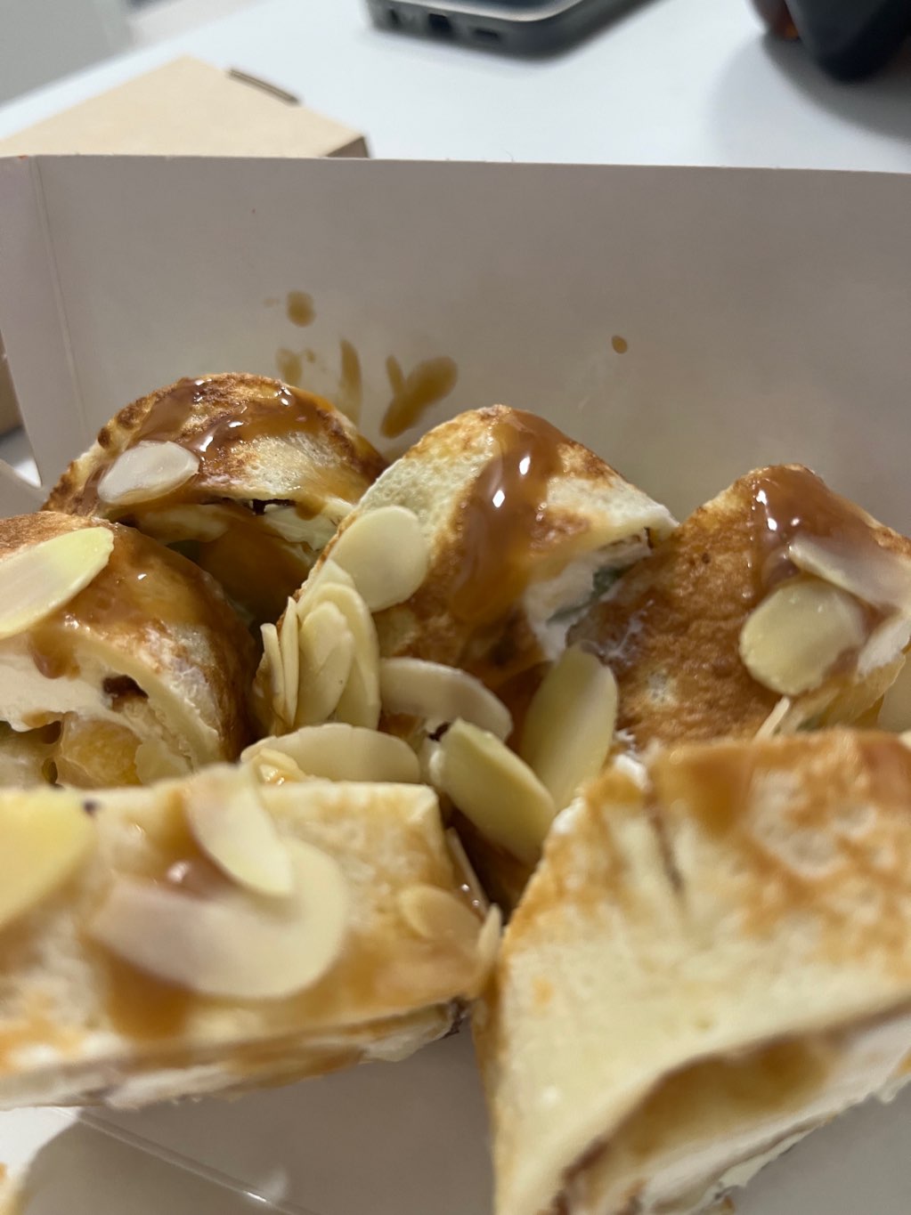 Состав: лосось, сливочный сыр, огурец, рис, тыква кампио, такуан, соус терияки, хлопья миндаля