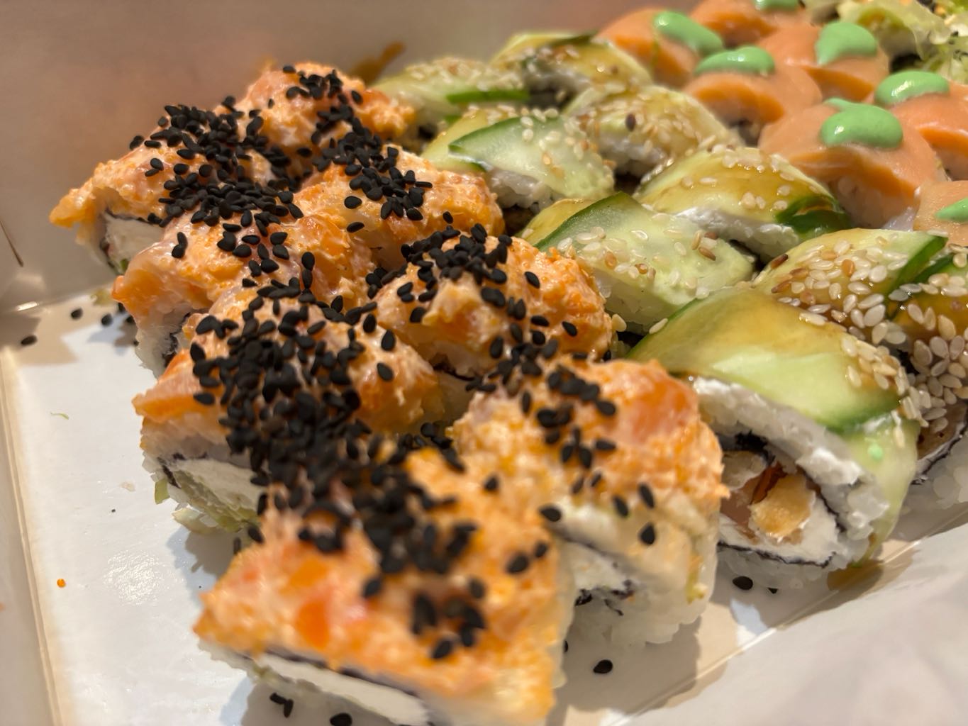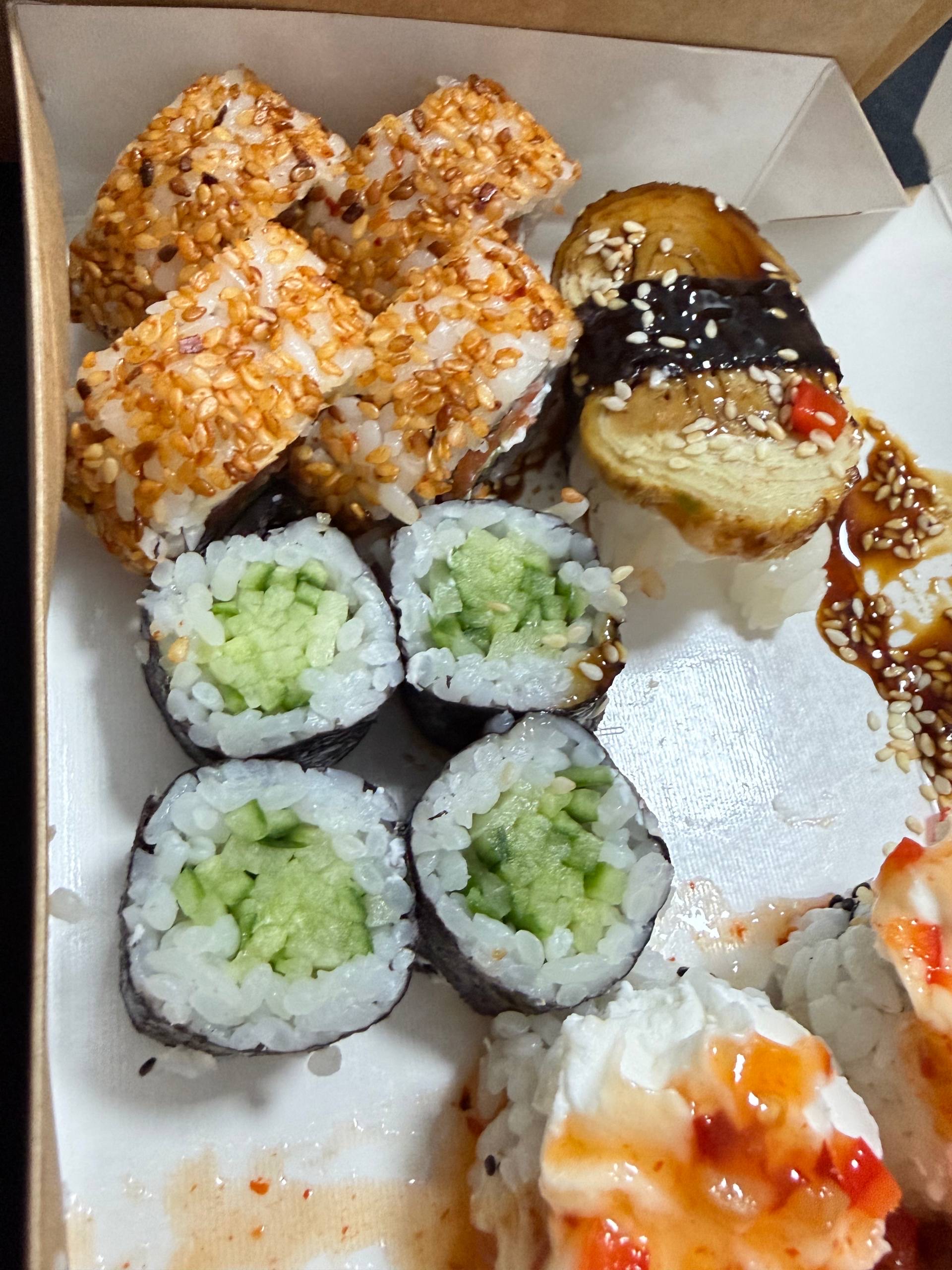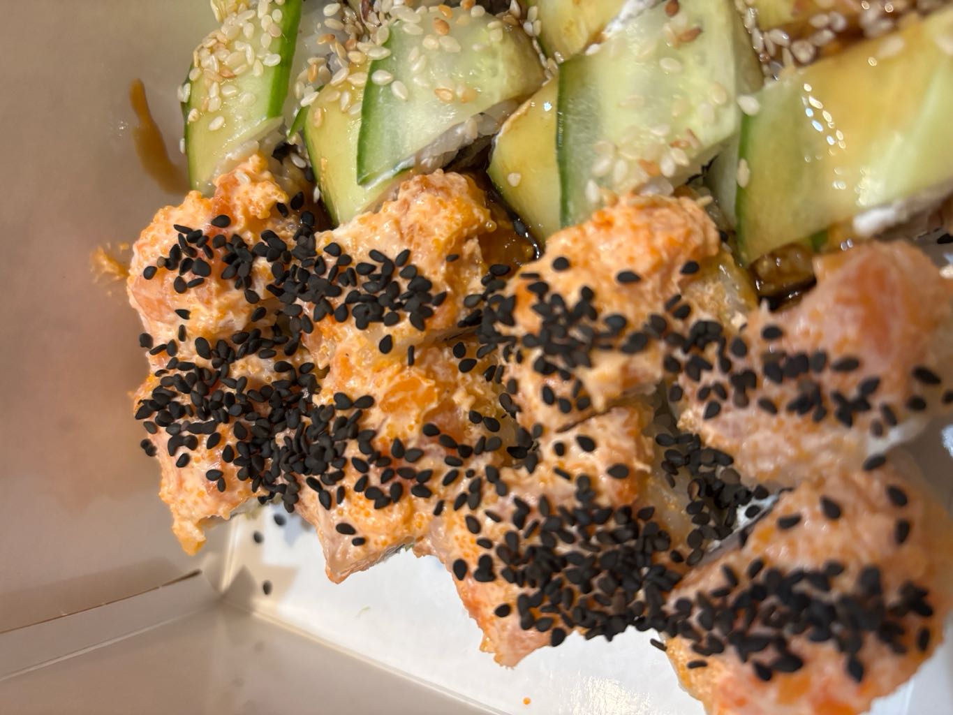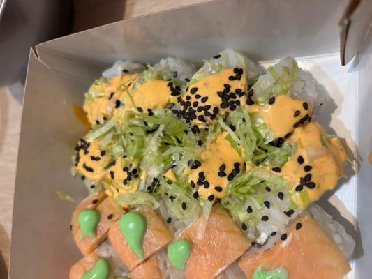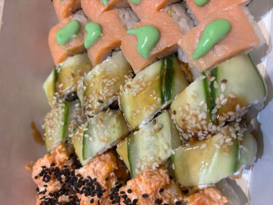 Состав: сом, копченый лосось, сливочный сыр, соус спайси, огурец, икра масаго, кунжут черный