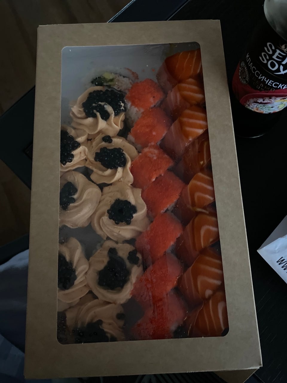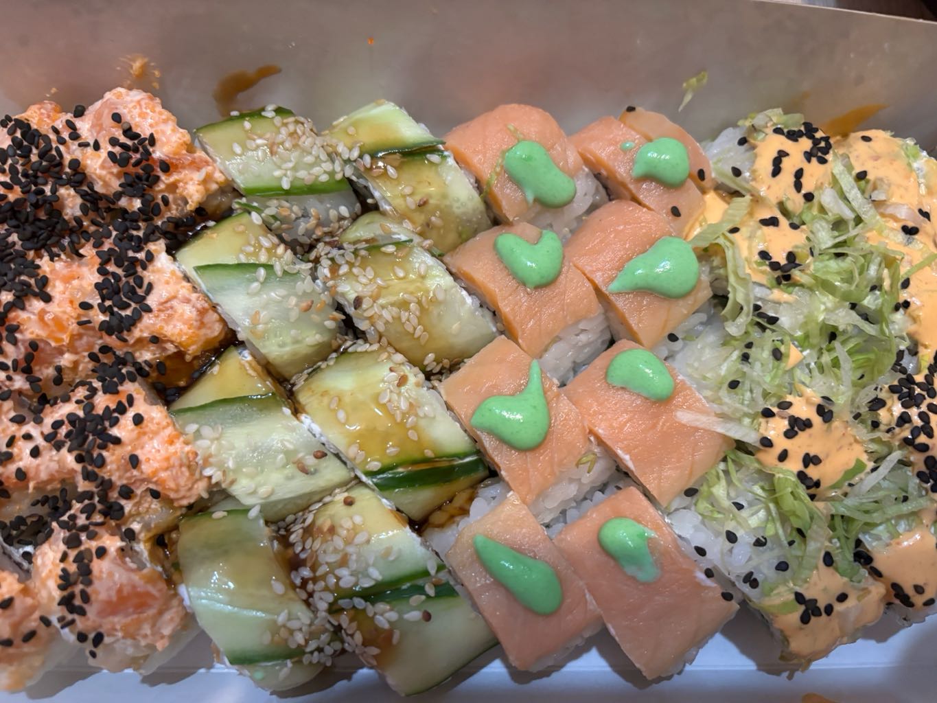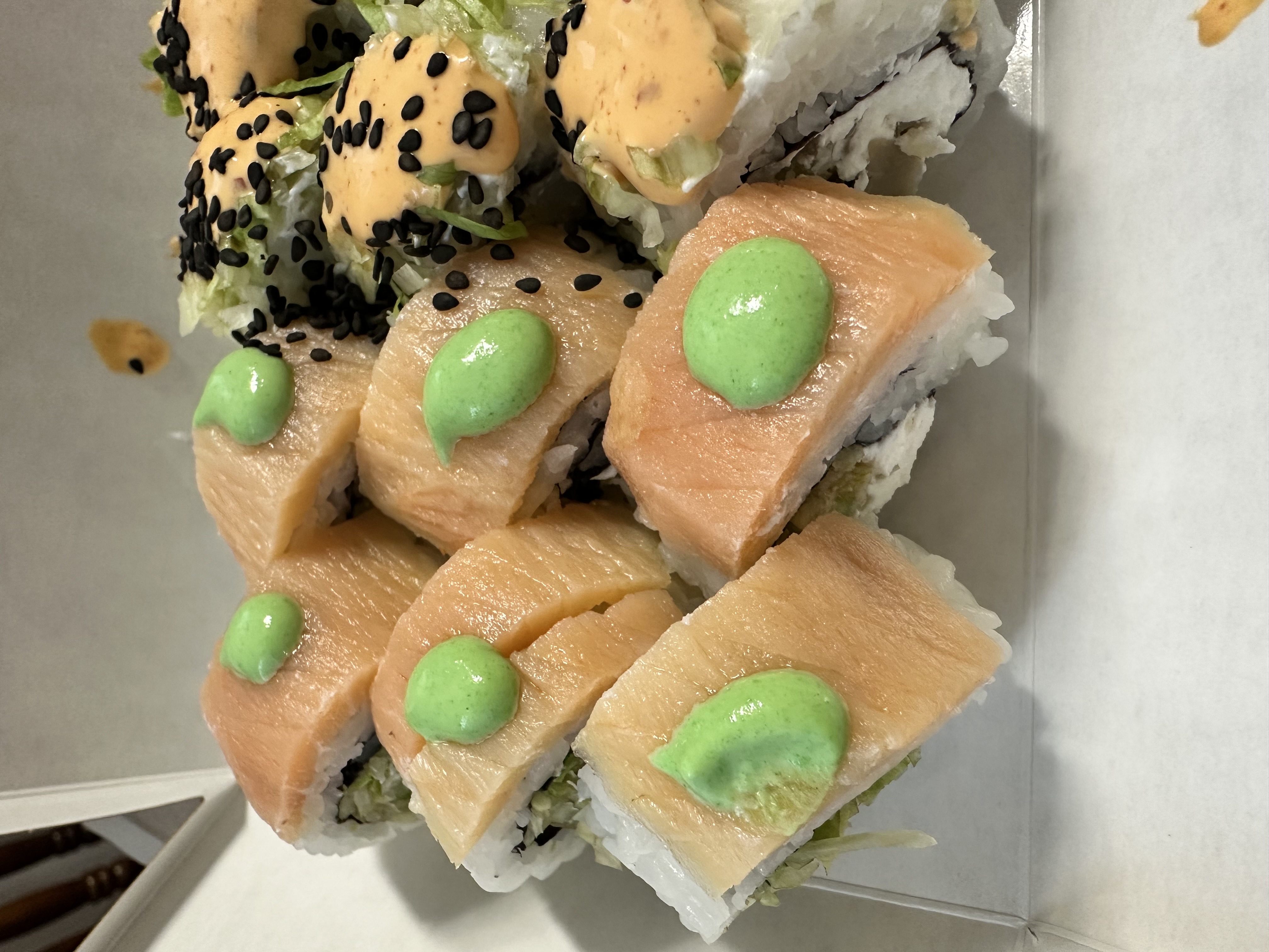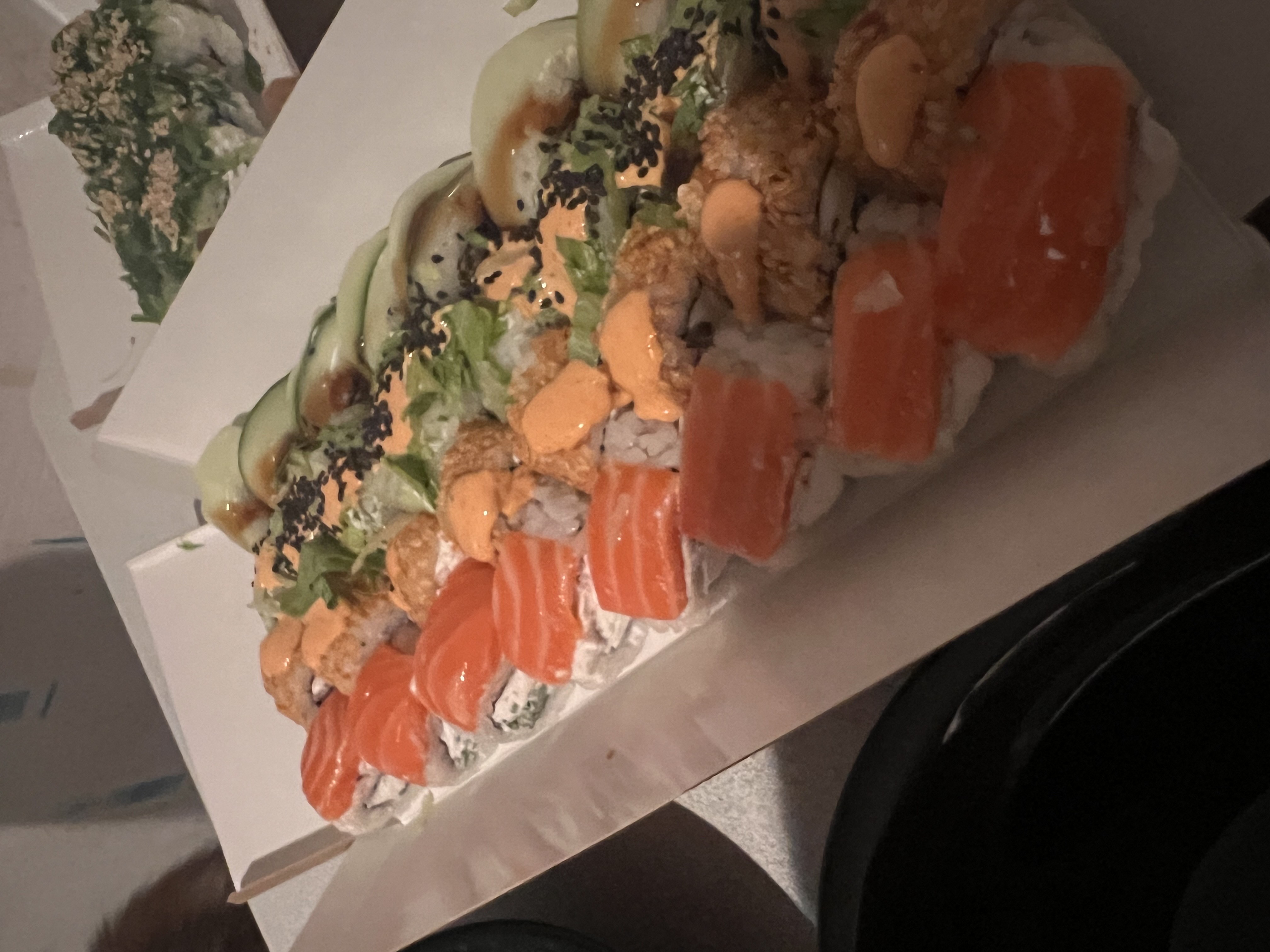 Состав: сом, копченый лосось, сливочный сыр, соус спайси, огурец, икра масаго, кунжут черный