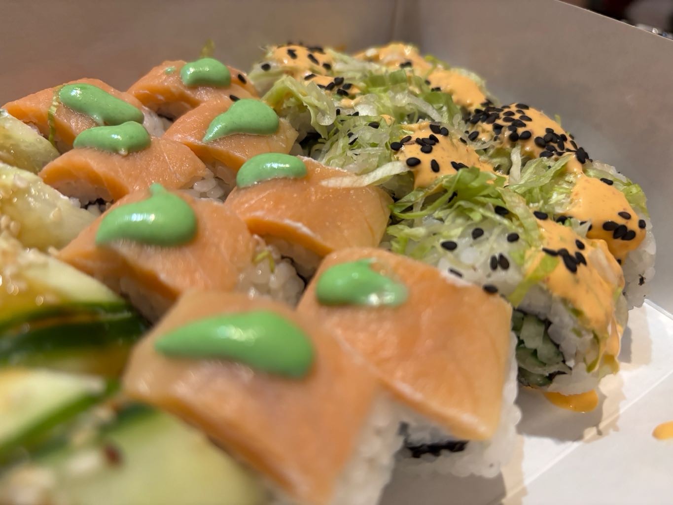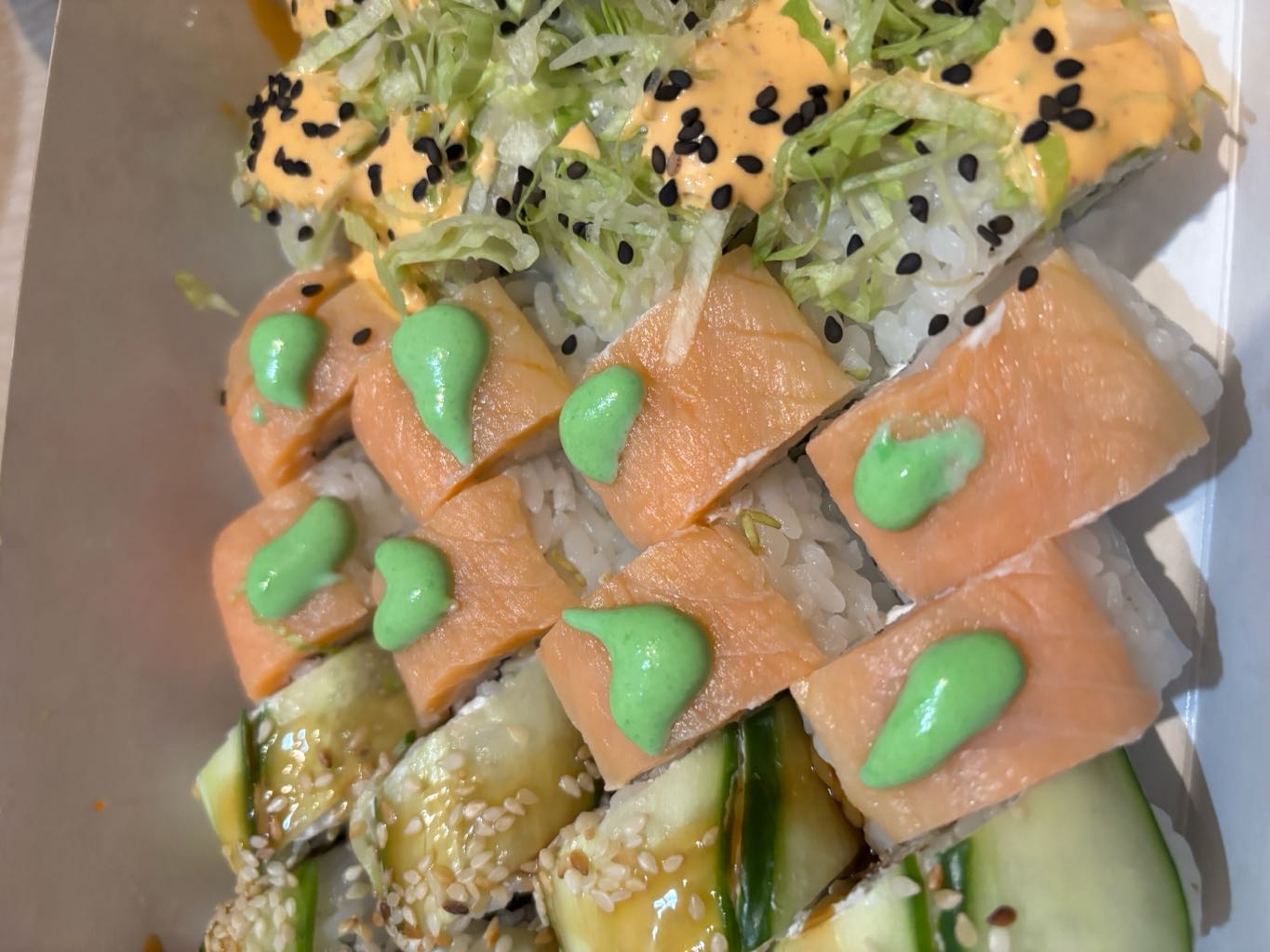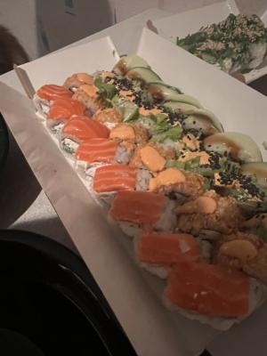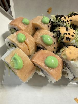 Состав: лосось, форель копченая, авокадо, огурец, рис, японский омлет, лук зеленый, соус спайси, стружка тунца