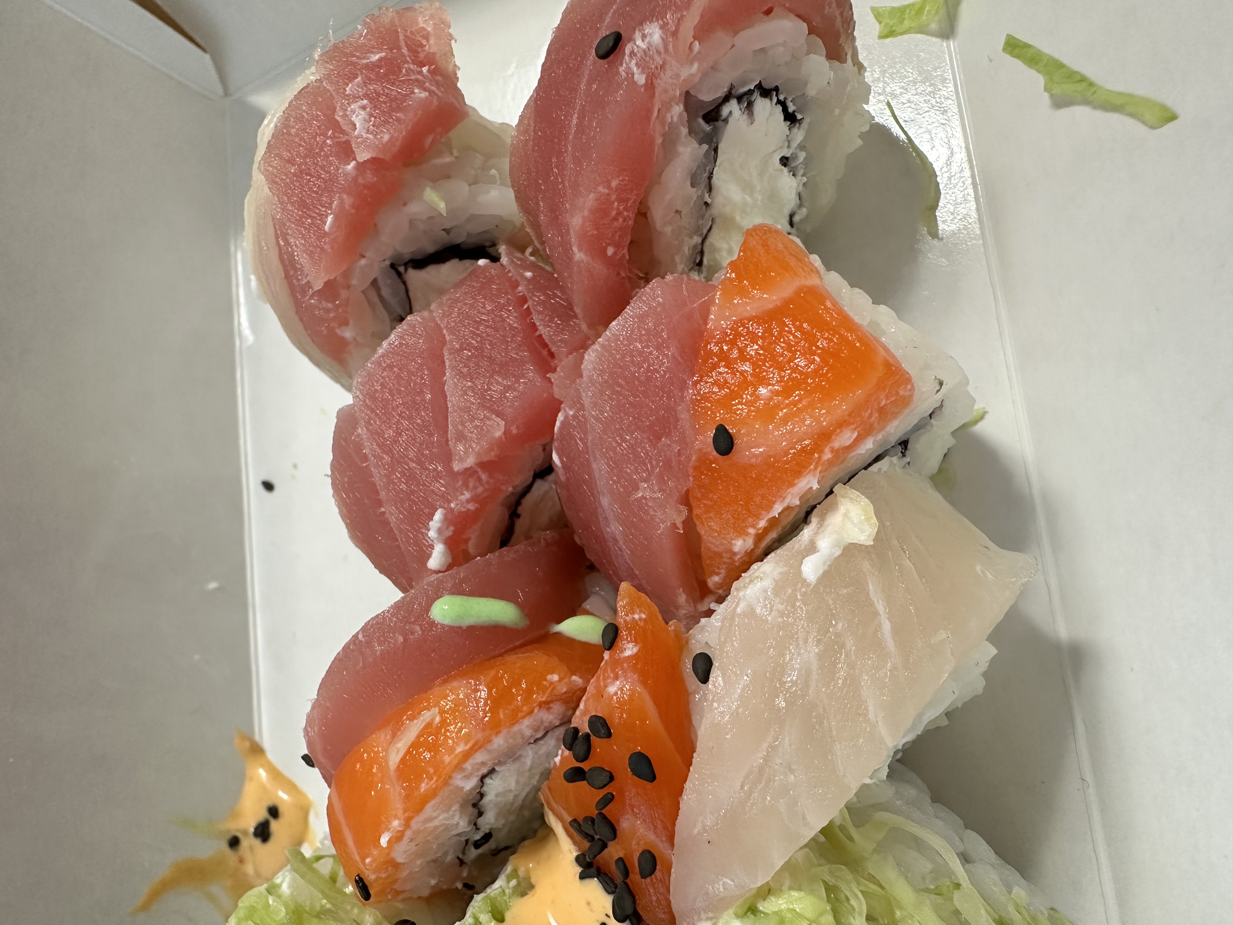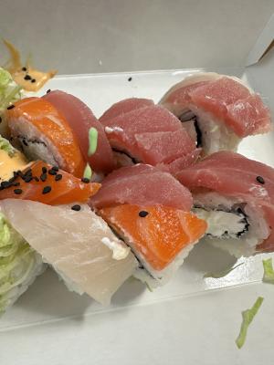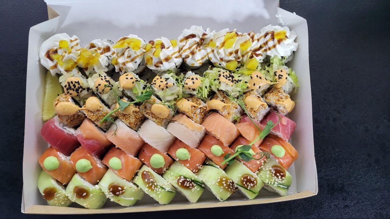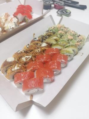 Состав: лосось, креветка, тунец, крабовые палочки, рис, майонез, икра масаго, соус унаги, рисовые шарики, соус крем-васаби