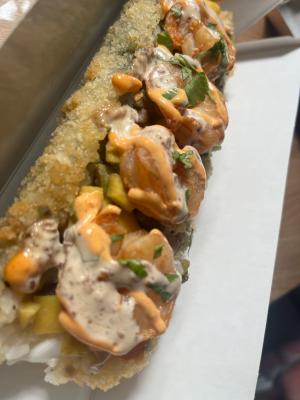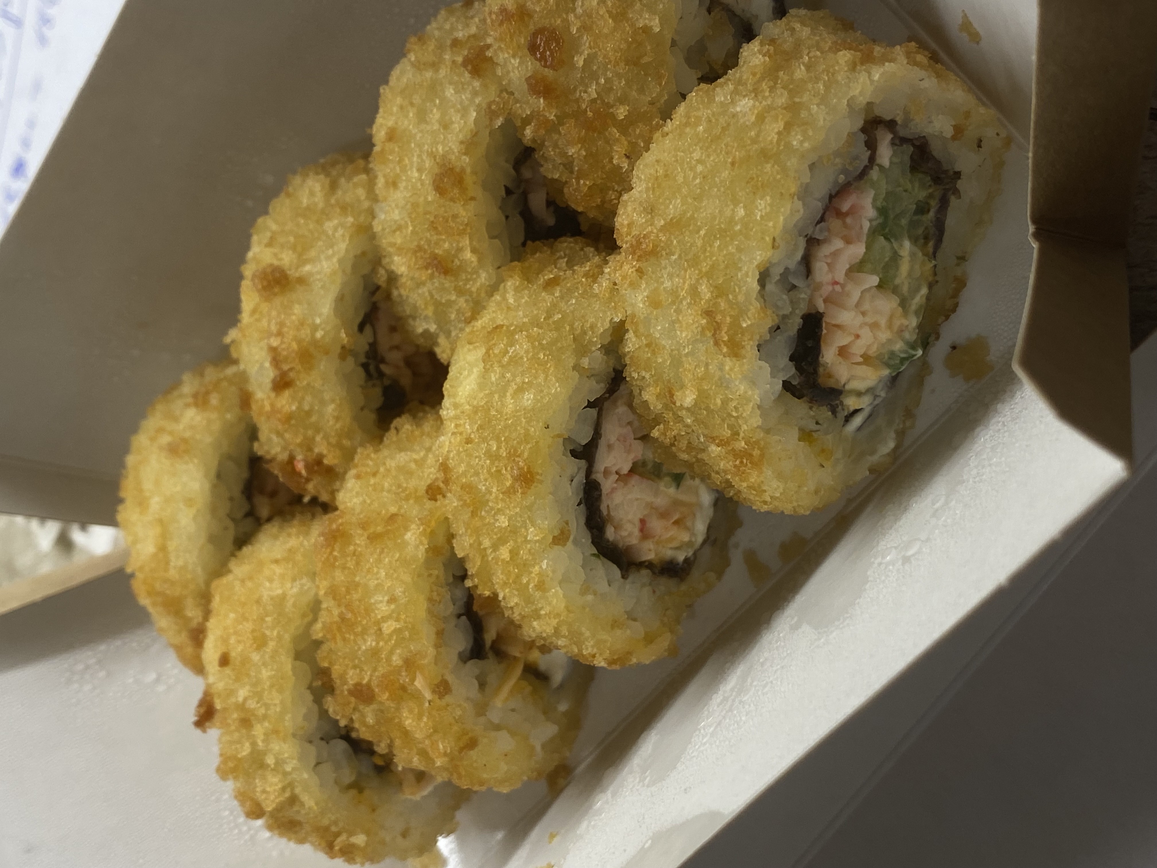 Состав: цыпленок ким-чи, сливочный сыр, огурец, рис, сыр чеддер, кранч лук, соус цезарь