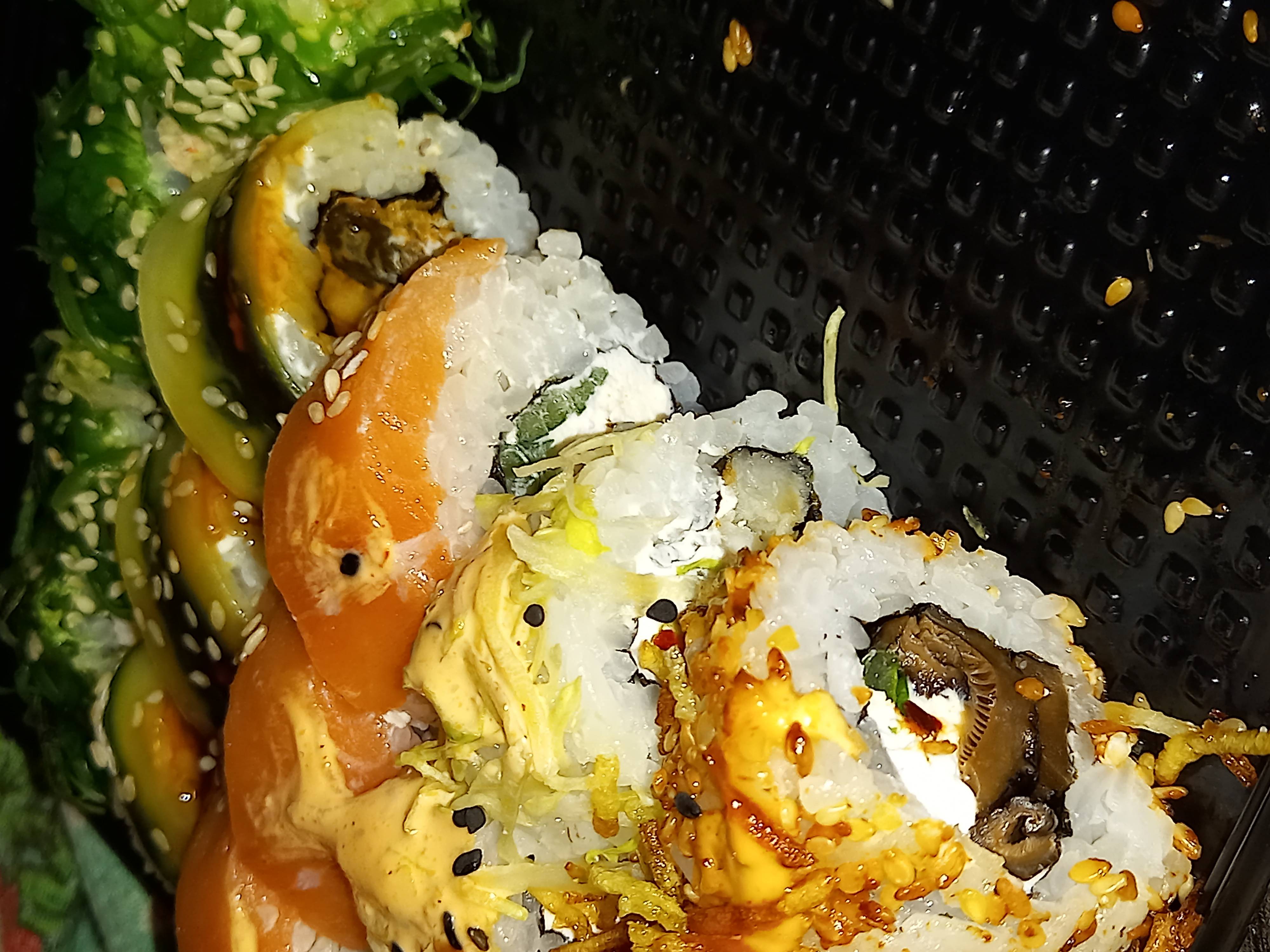Состав: грибы шиитаке, сливочный сыр, лук зеленый, кунжут кимчи, соус спайси