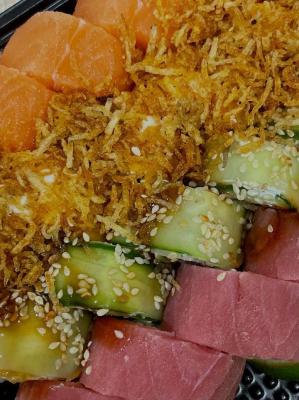 Состав: лосось, огурец, сливочный сыр, соус спайси, кунжут кимчи, соус терияки, кляр, сухари панко