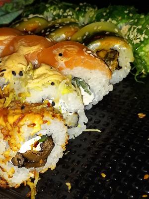 Состав: лосось, сливочный сыр, огурец, рис, тыква кампио, такуан, соус терияки, хлопья миндаля