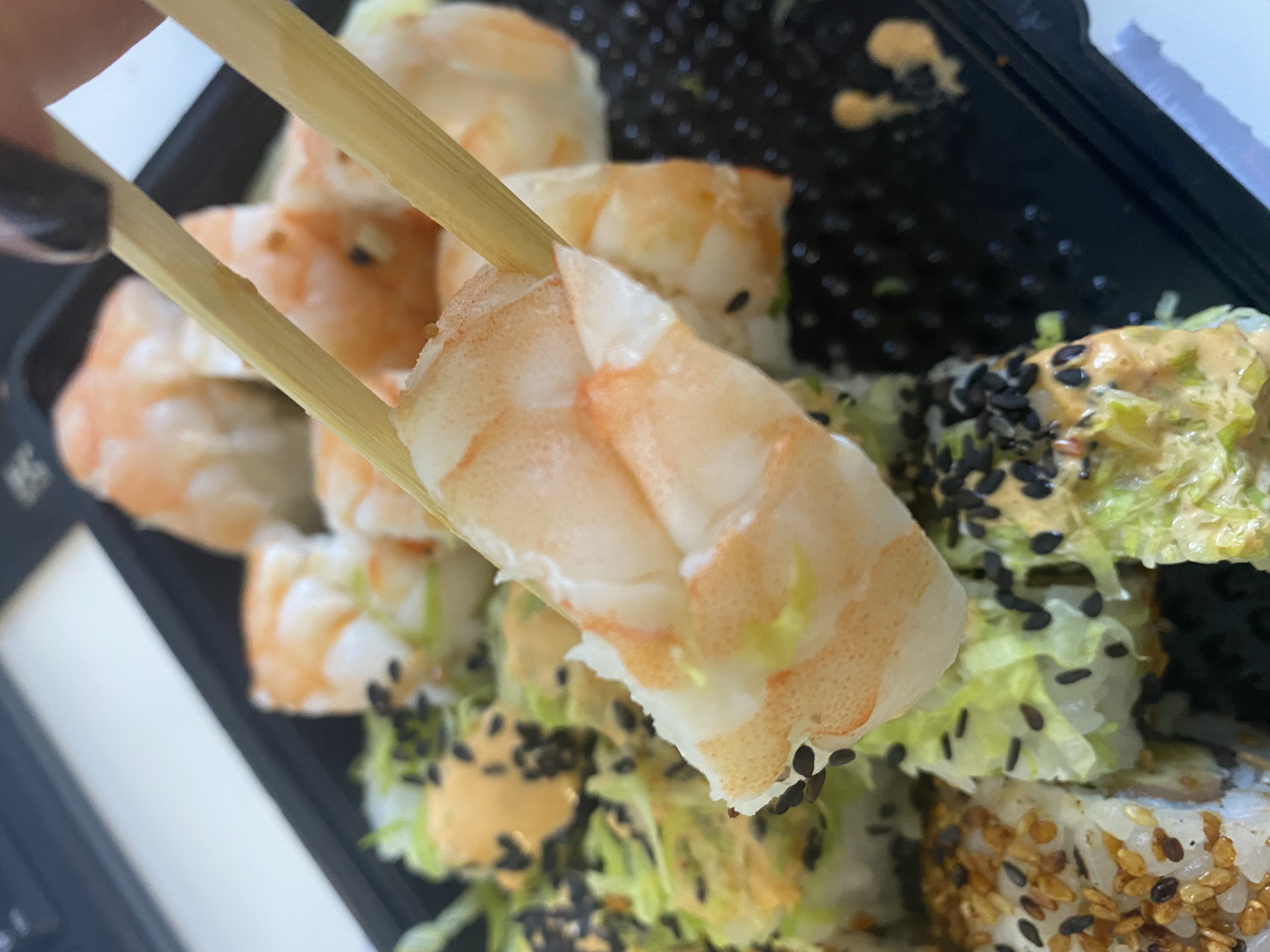 Состав: креветка, авокадо, манго, сливочный сыр, соус уорчестор, кунжутное масло, кунжут, сус кунжутный, петрушка