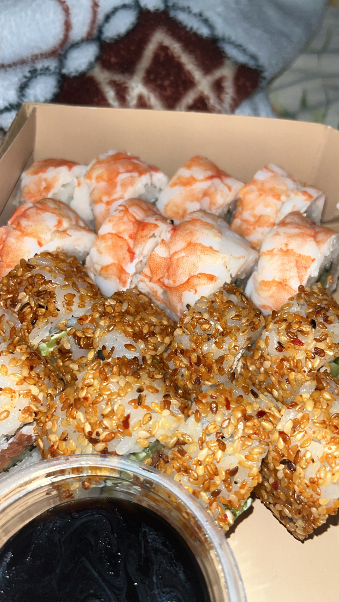 Состав: креветка, авокадо, манго, сливочный сыр, соус уорчестор, кунжутное масло, кунжут, сус кунжутный, петрушка