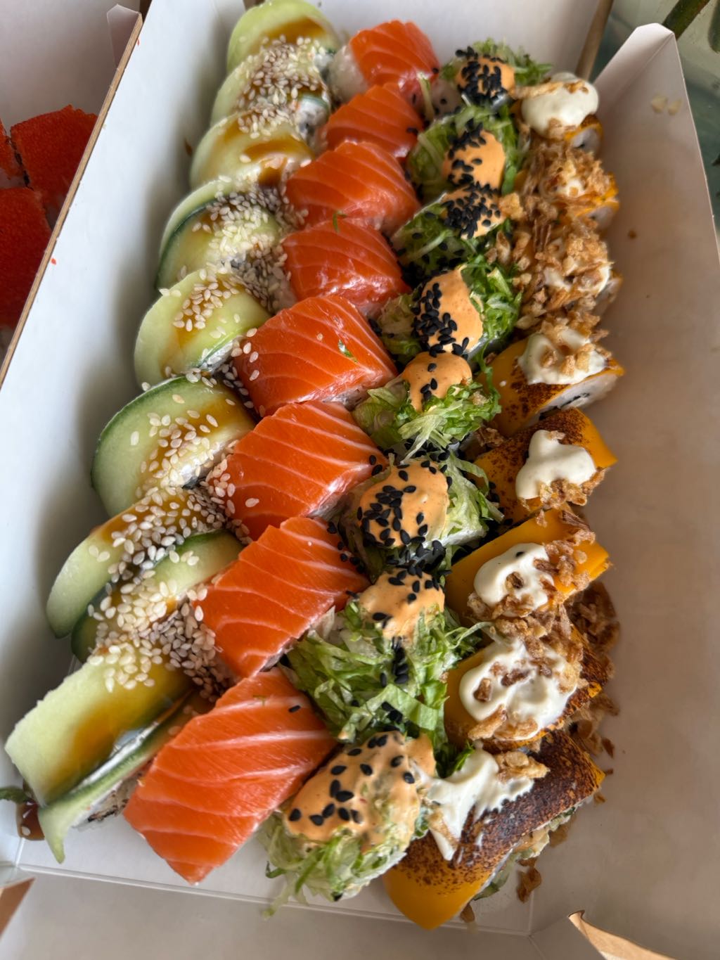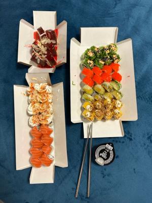 Состав: лосось, креветка, тунец, крабовые палочки, рис, майонез, икра масаго, соус унаги, рисовые шарики, соус крем-васаби
