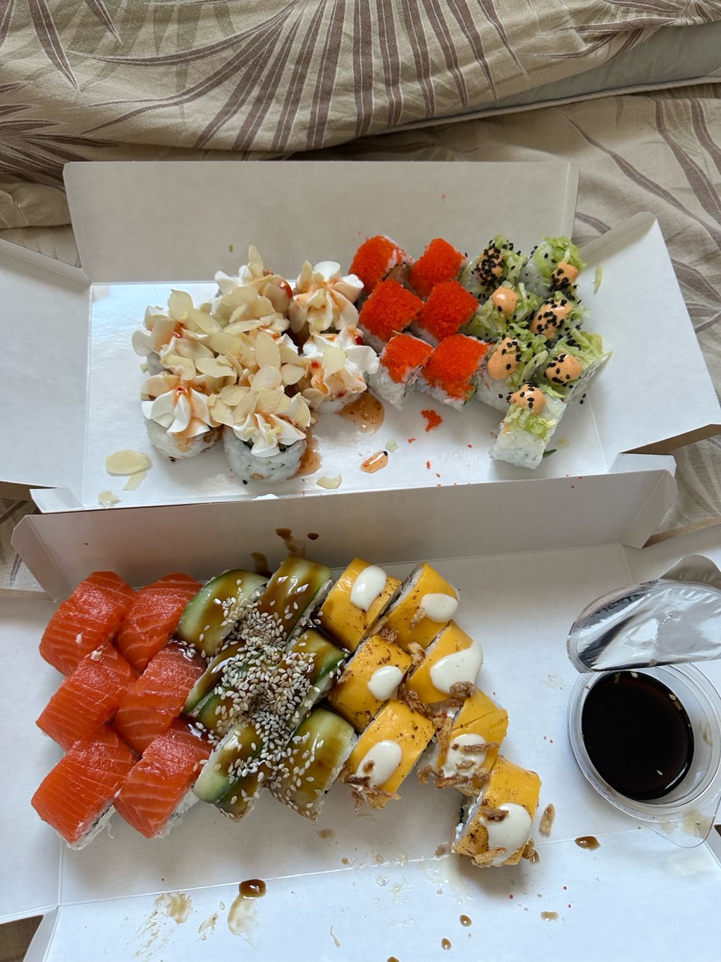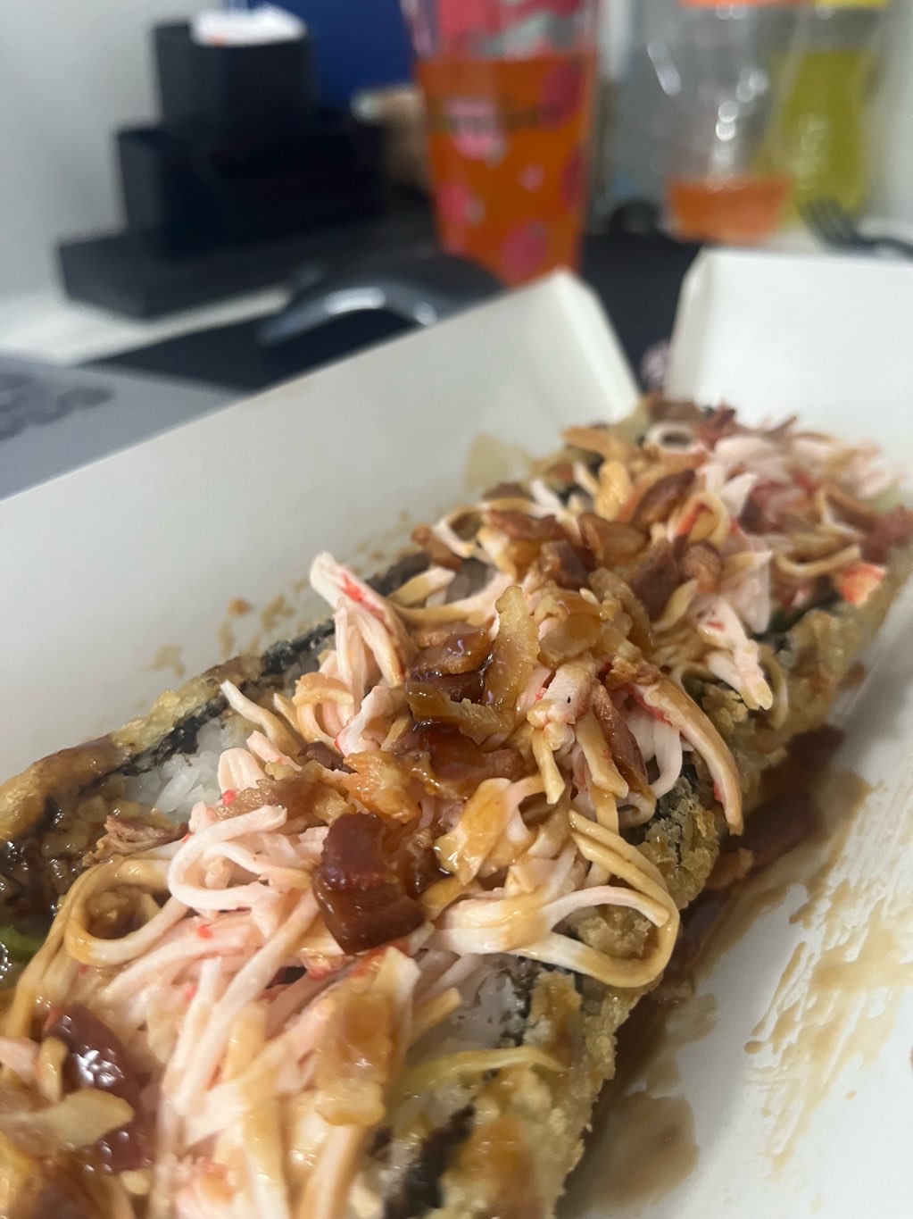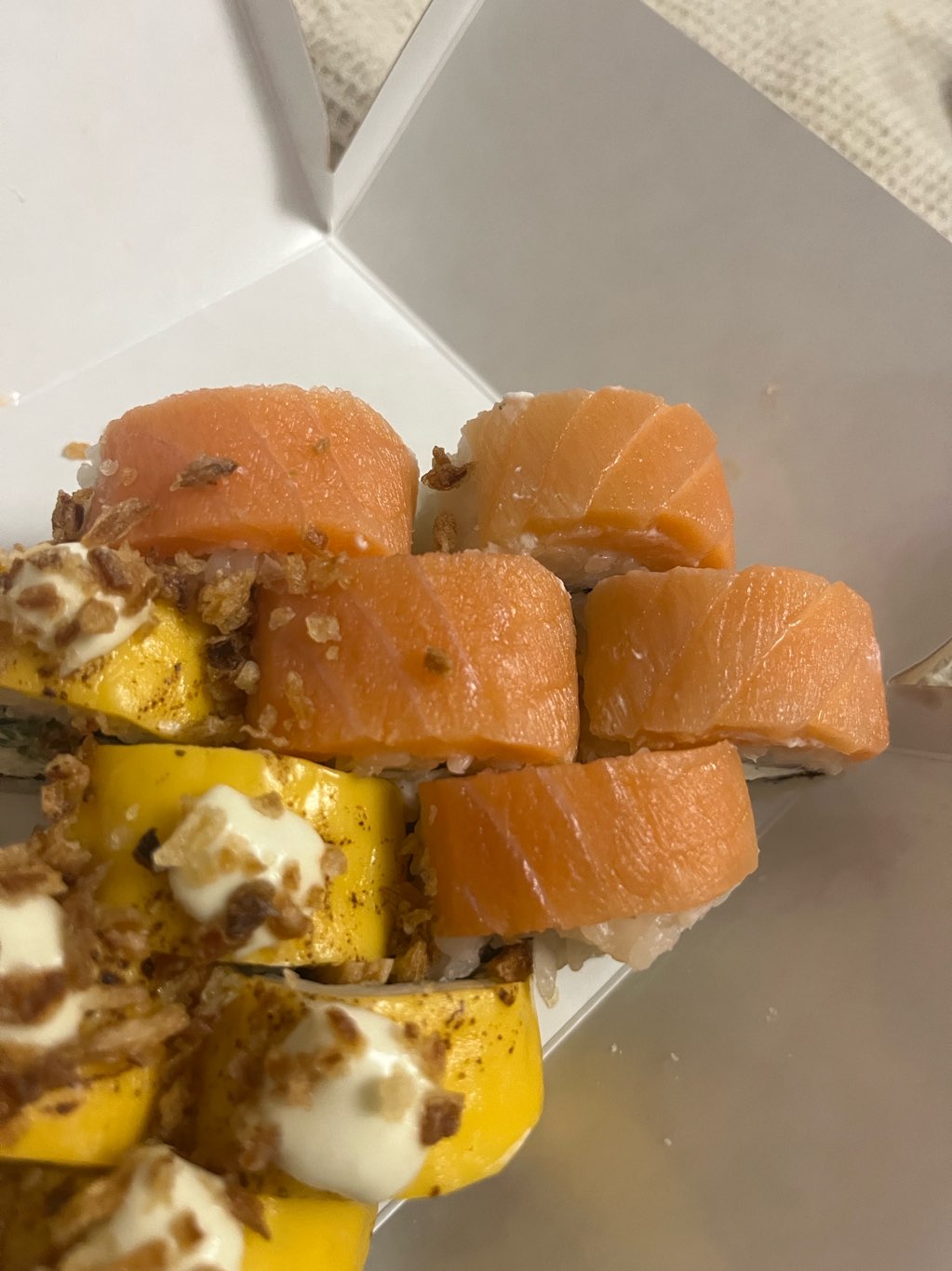 Состав: копченый лосось, темпура, лосось жаренный в соусе терияки, майонез