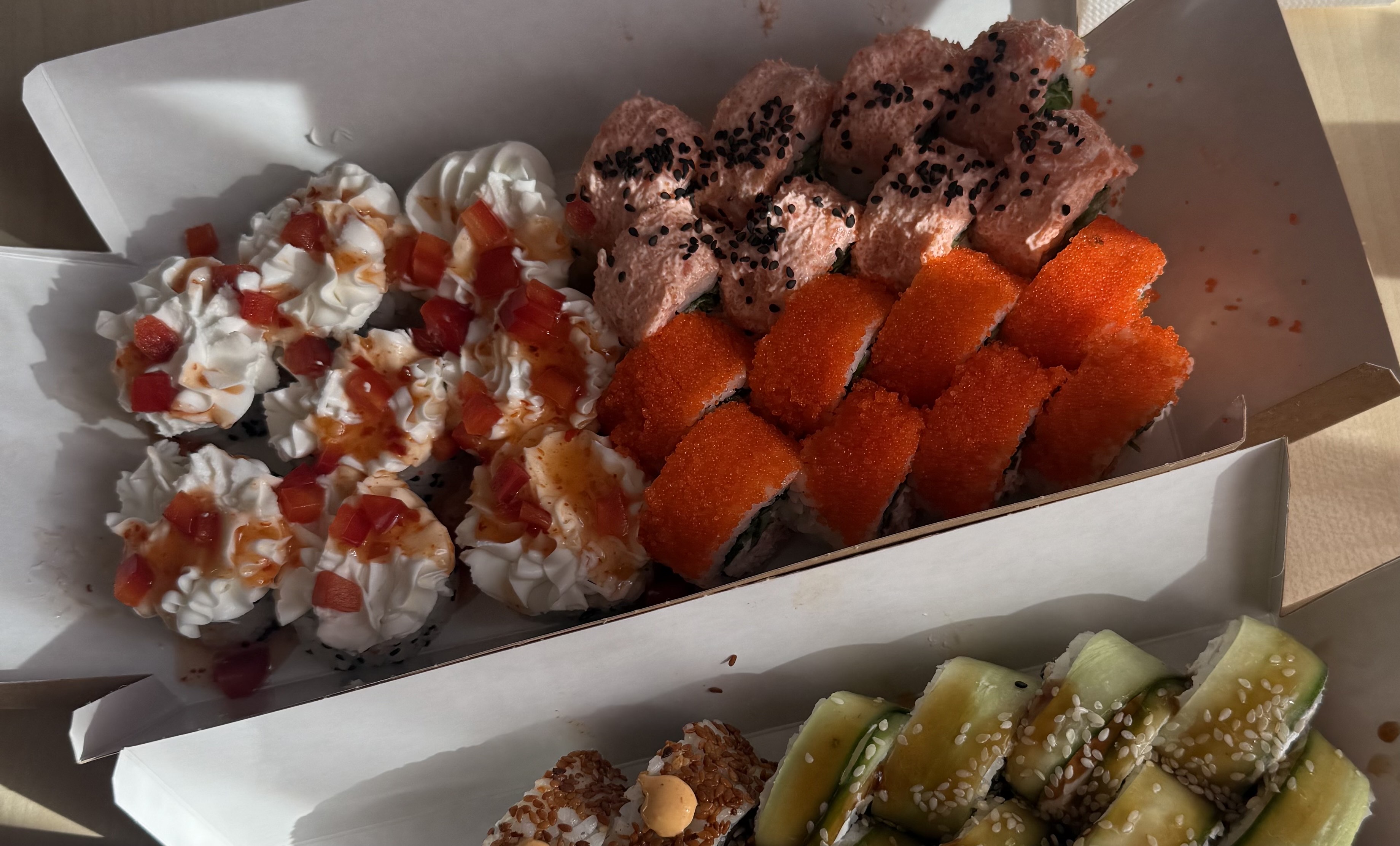 Состав: сом, копченый лосось, сливочный сыр, соус спайси, огурец, икра масаго, кунжут черный