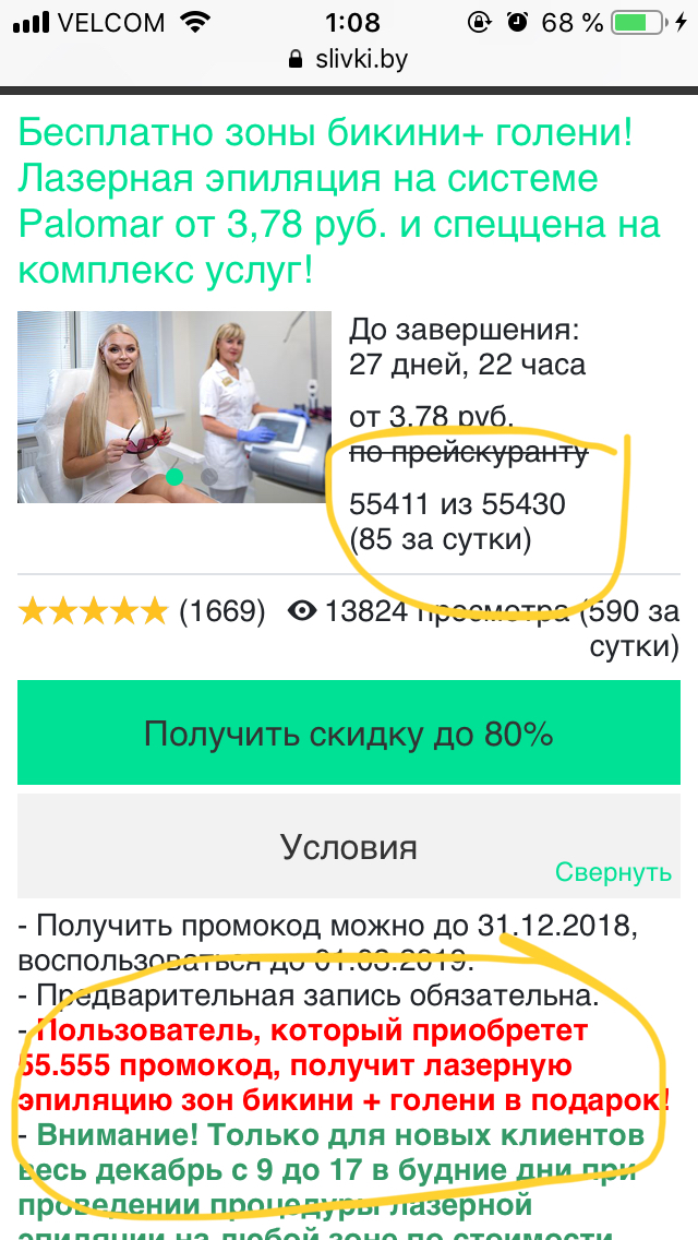 - Промокод также дает право на скидку до 90% на лазерную эпиляцию отдельных зон в центре эстетики "Лесанте"
