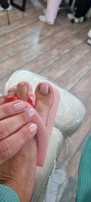 - обработка ногтей пальцев ног: придание формы ногтям, гигиеническая обработка кутикулы и боковых валиков аппаратным способом с использованием абразивных стерильных фрез, или комбинированным способом (фрезы + ножнички/кусачки), масло для кутикулы