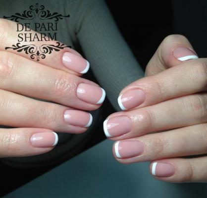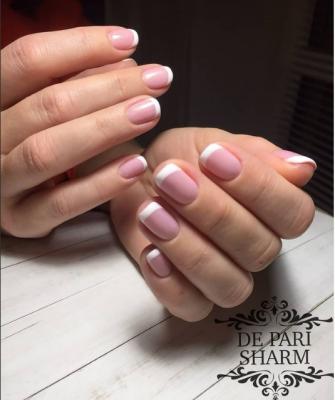 Пример нашей работы. Маникюр с долговременным покрытием, французкий маникюр.