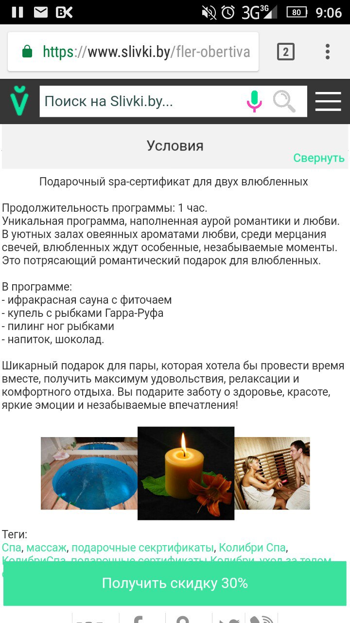 На сайте спа-салона я не нашла программы для влюблённых(длительностью 1 час, с промокодом стоимость 34 рубля), а на slivki.by, есть такая программа.