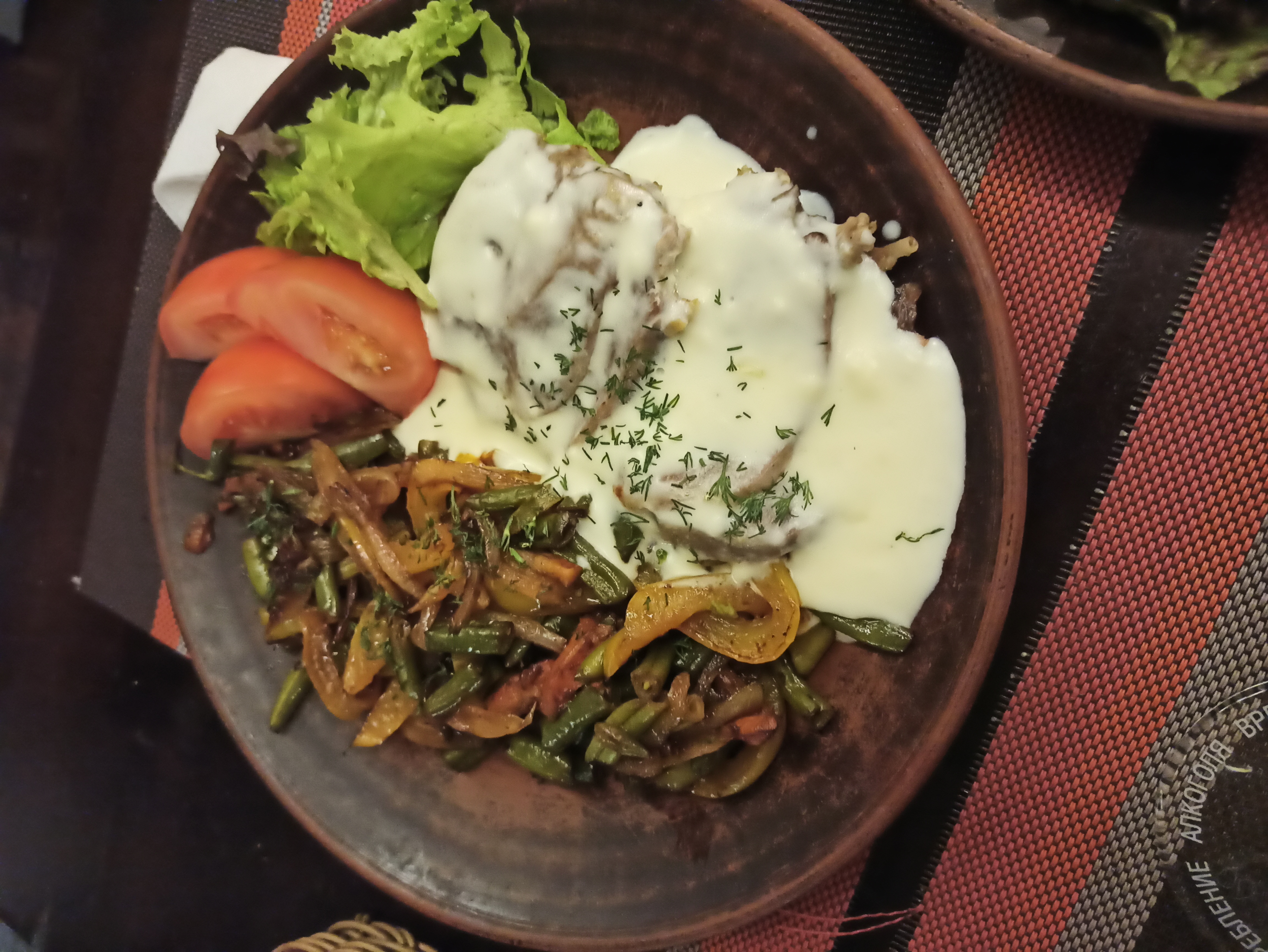 Язык под сливочным соусом (450 г) Состав: язык говяжий, фасоль стручковая, перец, лук, морковь, сливочный соус, свежие томаты |