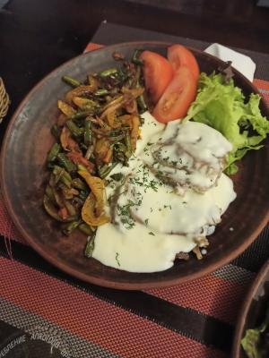 Филе куриное по-царски (340 г/25 г) Состав: филе куриное запеченное с грибами, перцем свежим, сыром и майонезом |