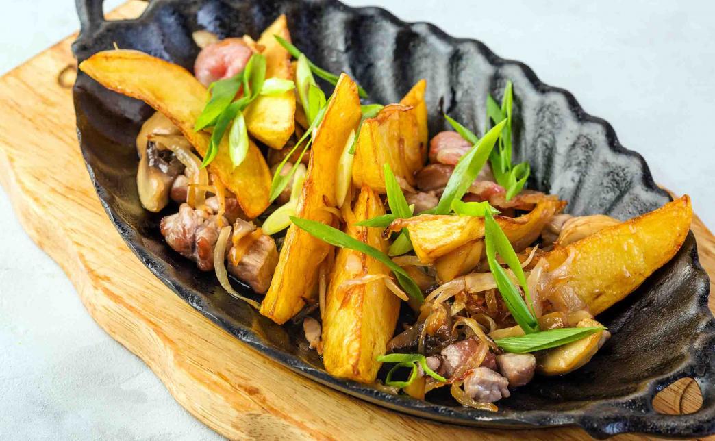 Скоблянка (390 г) Состав: говядина, куриное филе, лук, мясной соус, обжаренный картофель, свежие томаты, обжаренный перец, лук порей |