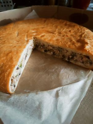 - закрытый пирог с курицей и грибами (900 г): дрожжевое тесто, филе курицы, соль, черный молотый перец, шампиньоны, сливочное масло