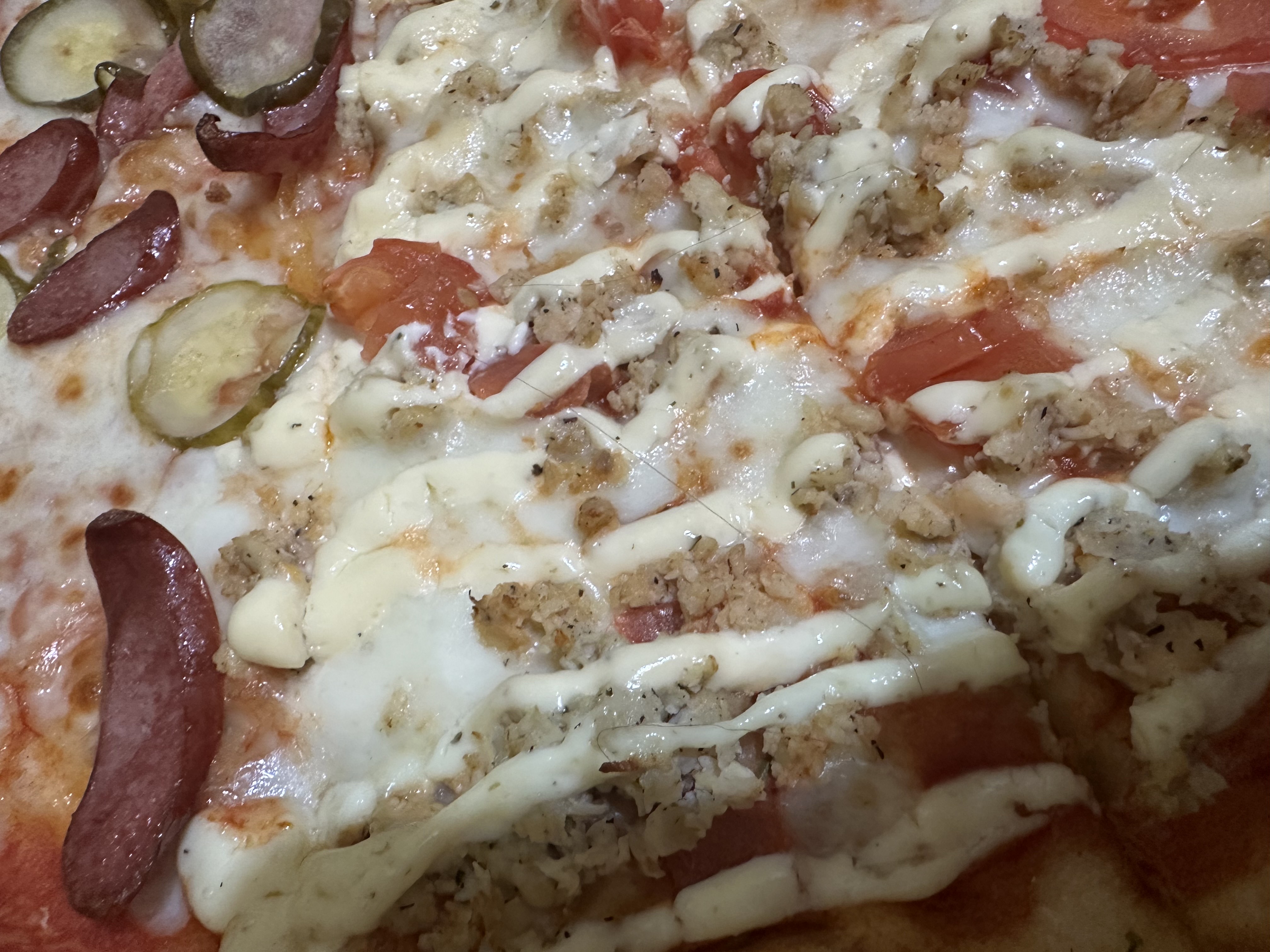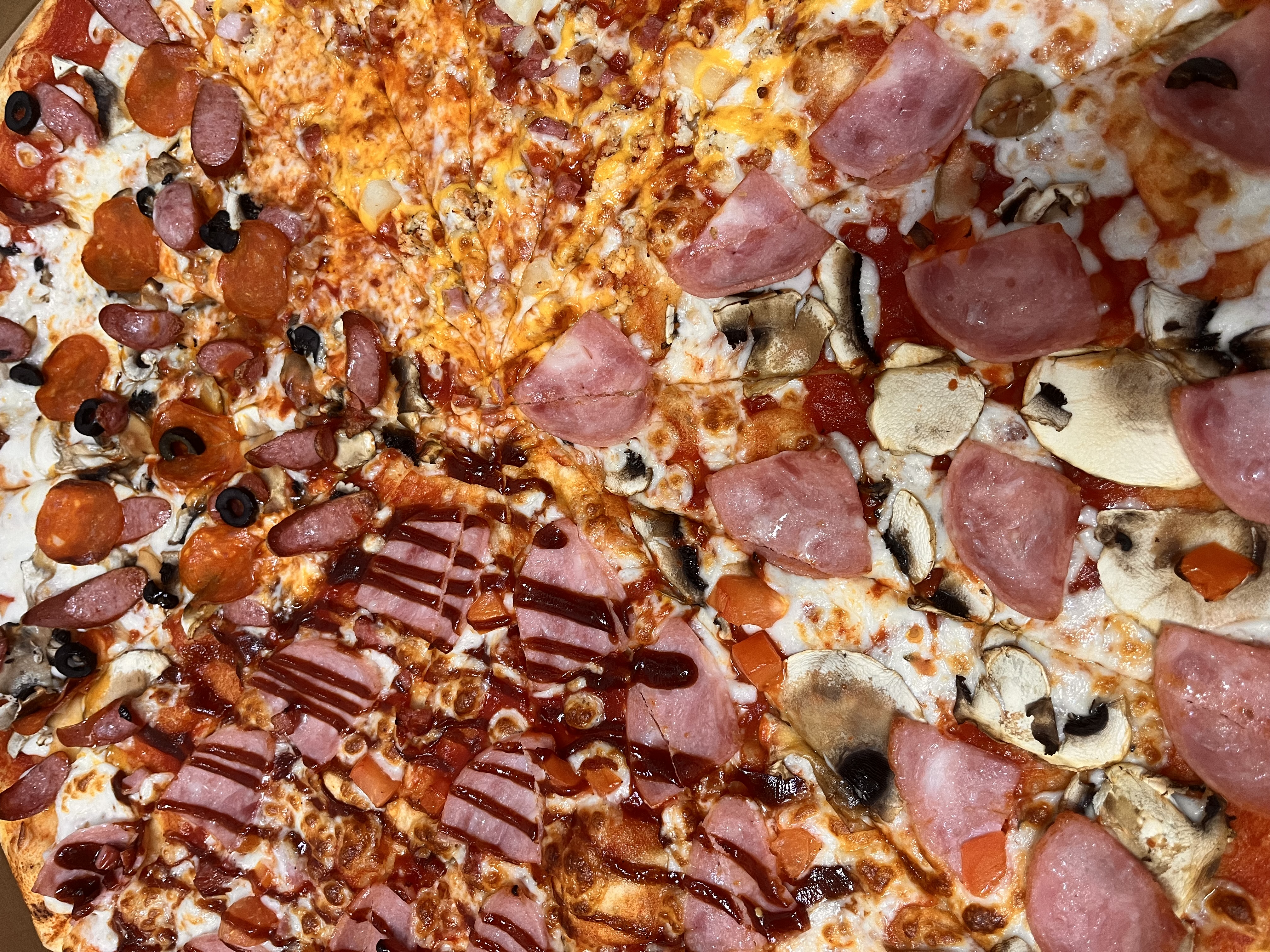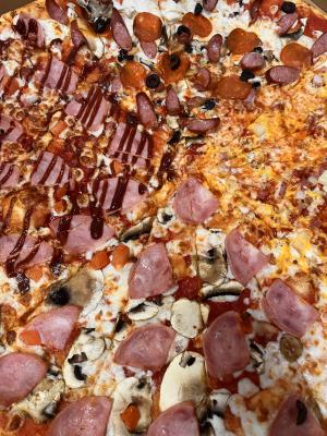 -  мега-пицца "Мясная" (60 см, 2000 г): моцарелла, пицца-соус, бекон, пепперони, курица, томат, грибы, ветчина куриная, колбаски охотничьи, огурец маринованный, соус (ранч, горчичный, барбекю)
