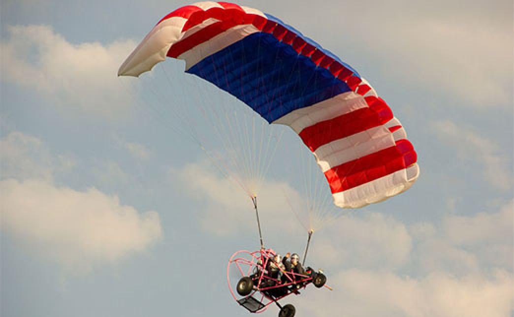 Аэрошют - это тележка с мотором, винтом и парашютом. Грузоподъемность аппарата составляет 450 кг, это значит, что пилоту не грозит одиночество, аппарат поднимет в небо пассажира до 100 кг. Скорость полета невелика 50 км/ч, а высота - от "бреющего" в одном-двух метрах от земли до заоблачных. Продолжительность полета от 10 минут до 1 часа.