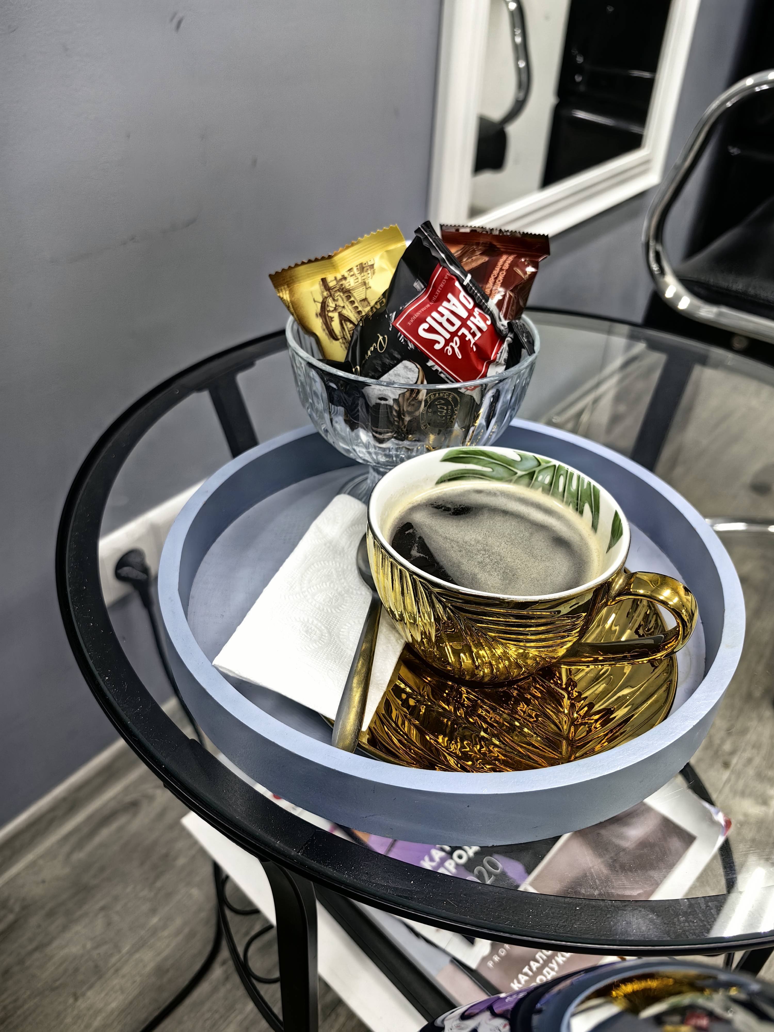 Внутри салона красиво, стильный интерьер. Т.к окрашивание занимает длительное время, мне принесли вкусный кофе и 4 большие канфеты, что было очень кстати! Такие мелочи показывают уровень!