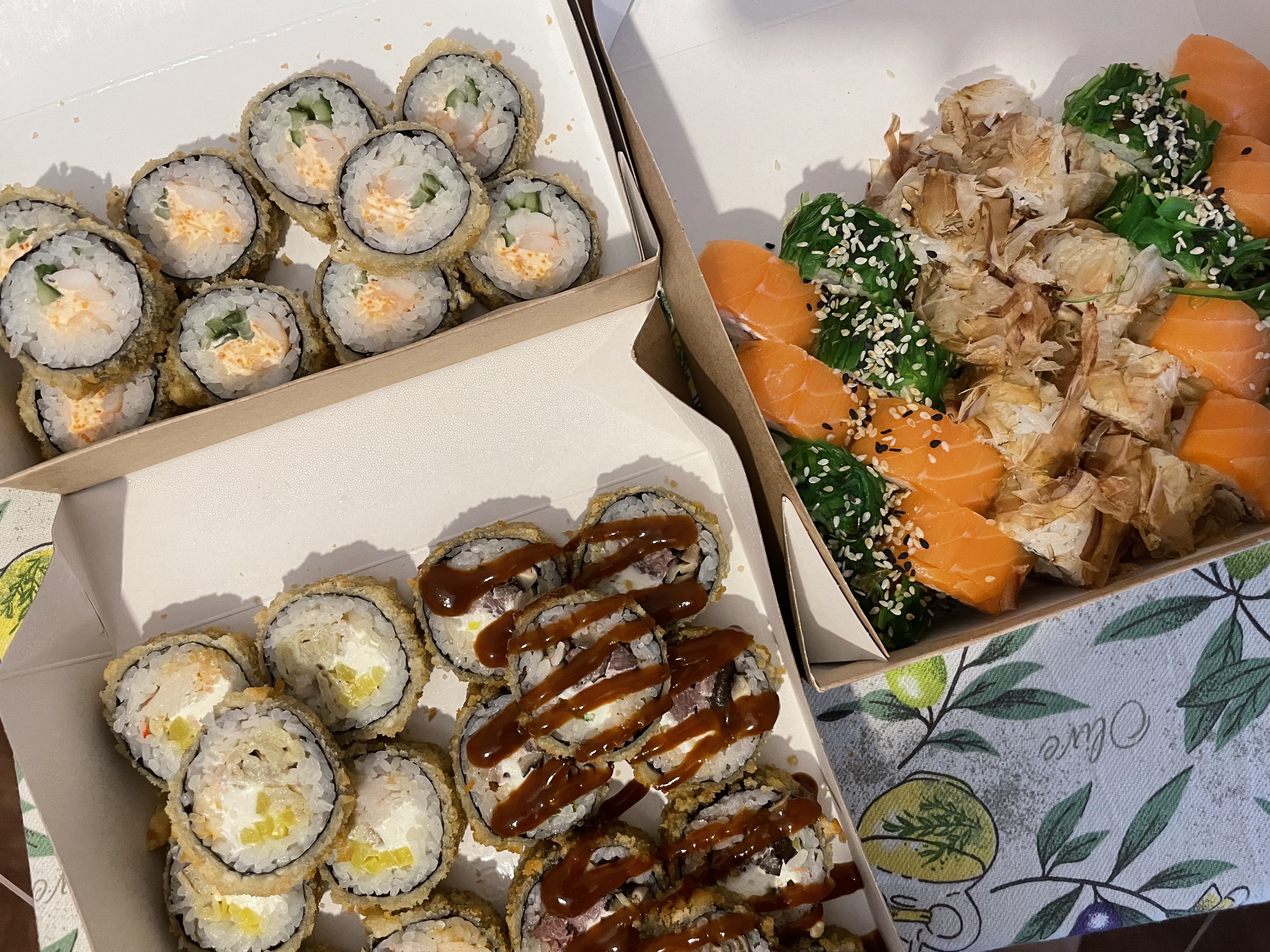 - "Хотсити": жареный морской окунь, сливочный сыр, огурец, омлет тамаго, сырный соус, нори, соус терияки - 8 шт.