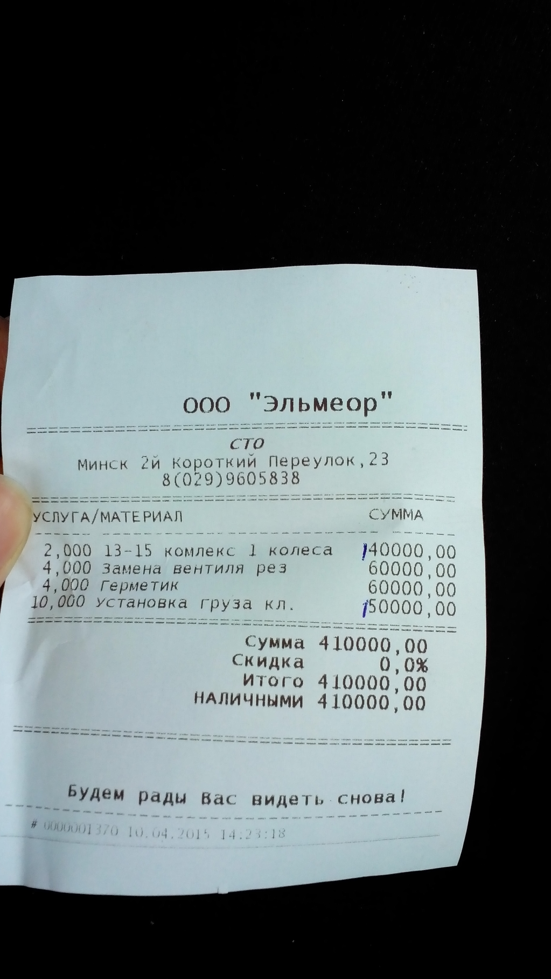 Уважаемая svetlana.sk0705. Кассовый аппарат у нас исправен, равно как и балансировочный станок( к слову в эксплуатации он меньше года и великолепно балансирует). По чеку: для удобства наших клиентов мы выдаем дополнительно полную распечатку выполненных работ, чтобы человек видел какие услуги и материалы были использованы при обслуживании. В случае спорных вариантов, который к сожалению возник в Вашем случае, по этой распечатке тоже весьма удобно отследить, перечень оказанных услуг. Да, есть Временная проблема - не отображаются первая цифра в столбце - поэтому и приходится дописывать ручкой. Проблема скоро решится. Но все честно и поверьте - эта распечатка лишь для удобства наших клиентов.