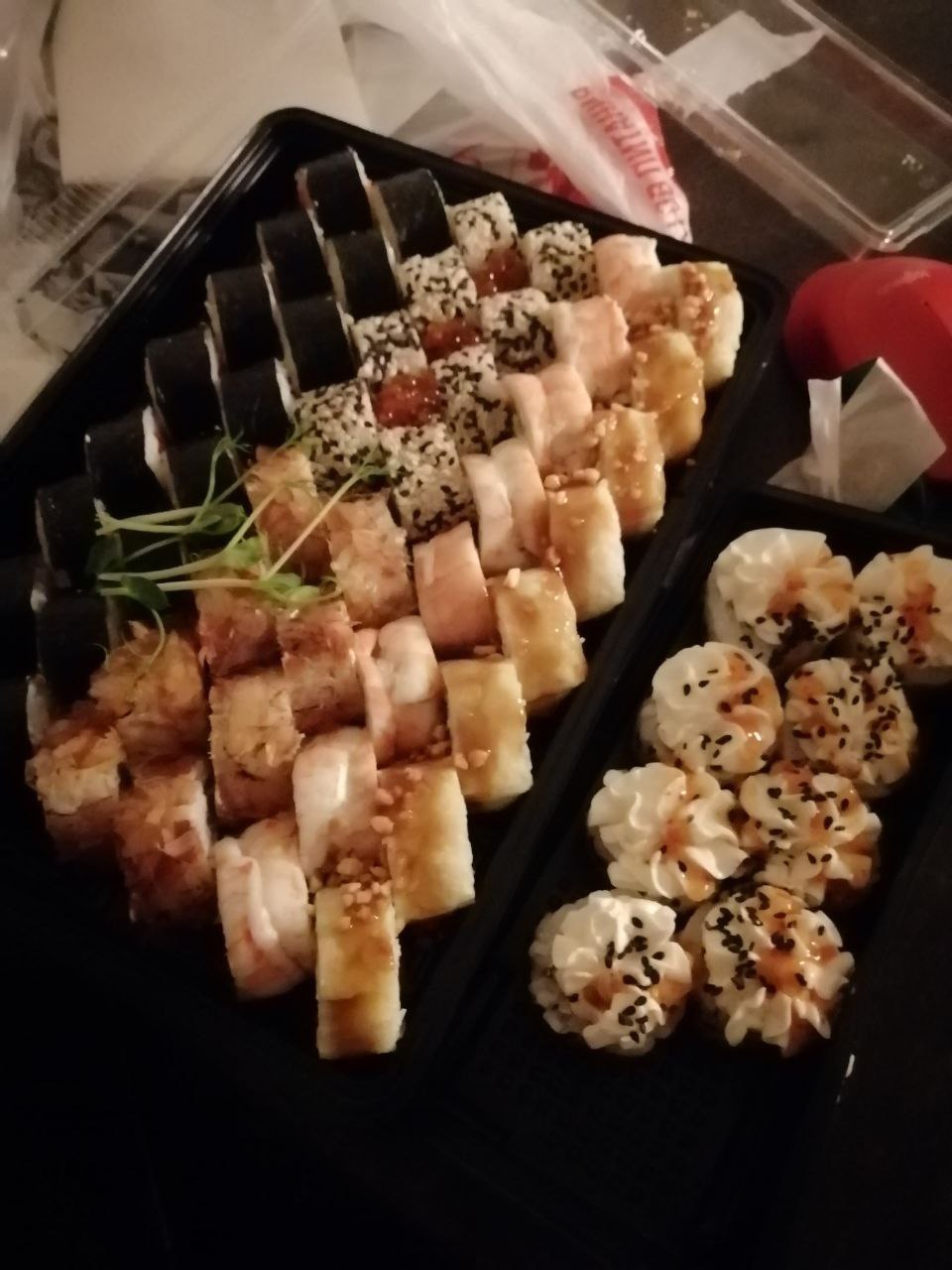 - На 1 суши-сет прилагается не более 4 комплектов палочек