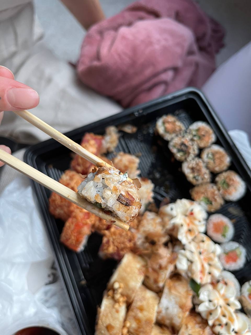 - На 1 суши-сет прилагается не более 4 комплектов палочек