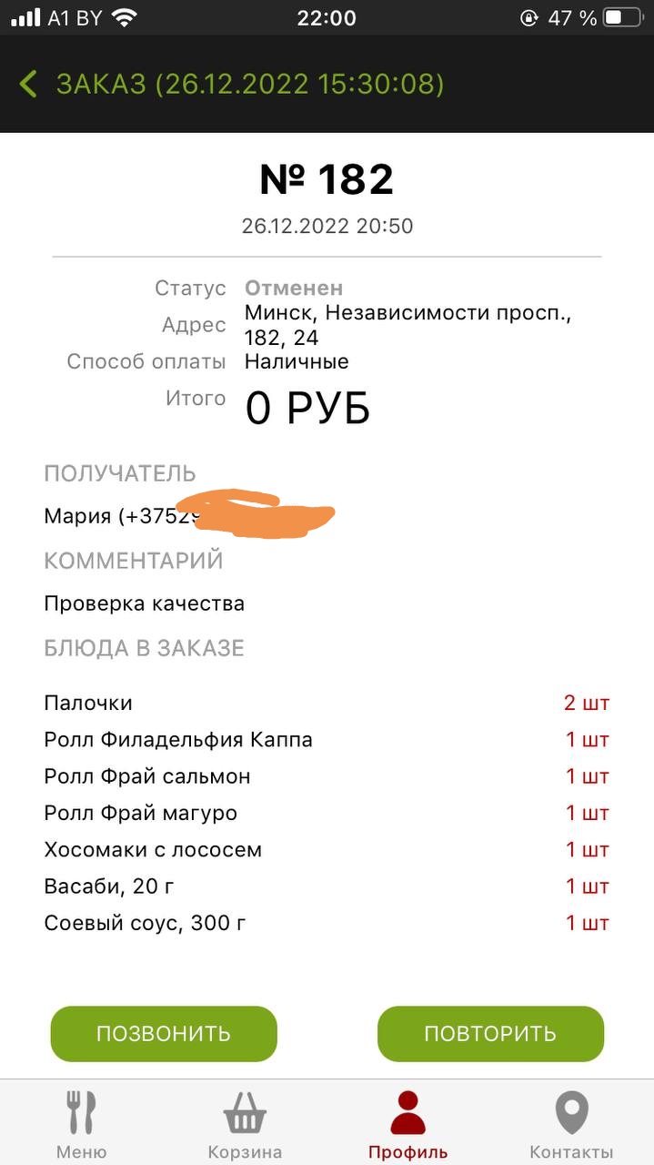 - Статус самовывоза и доставки можно изменить только по предварительной договоренности с колл-центром по номеру телефона 7119