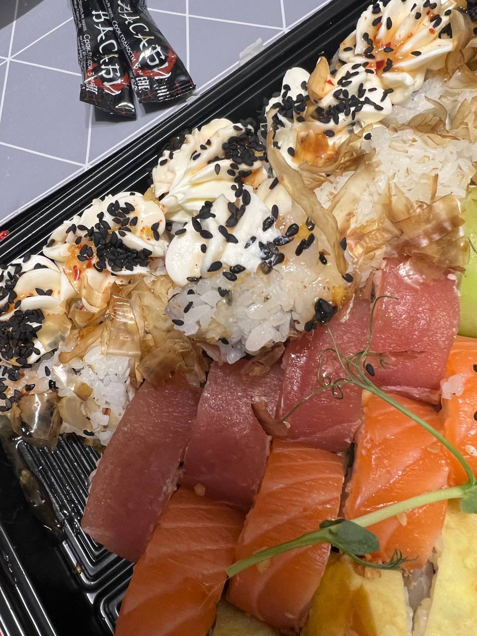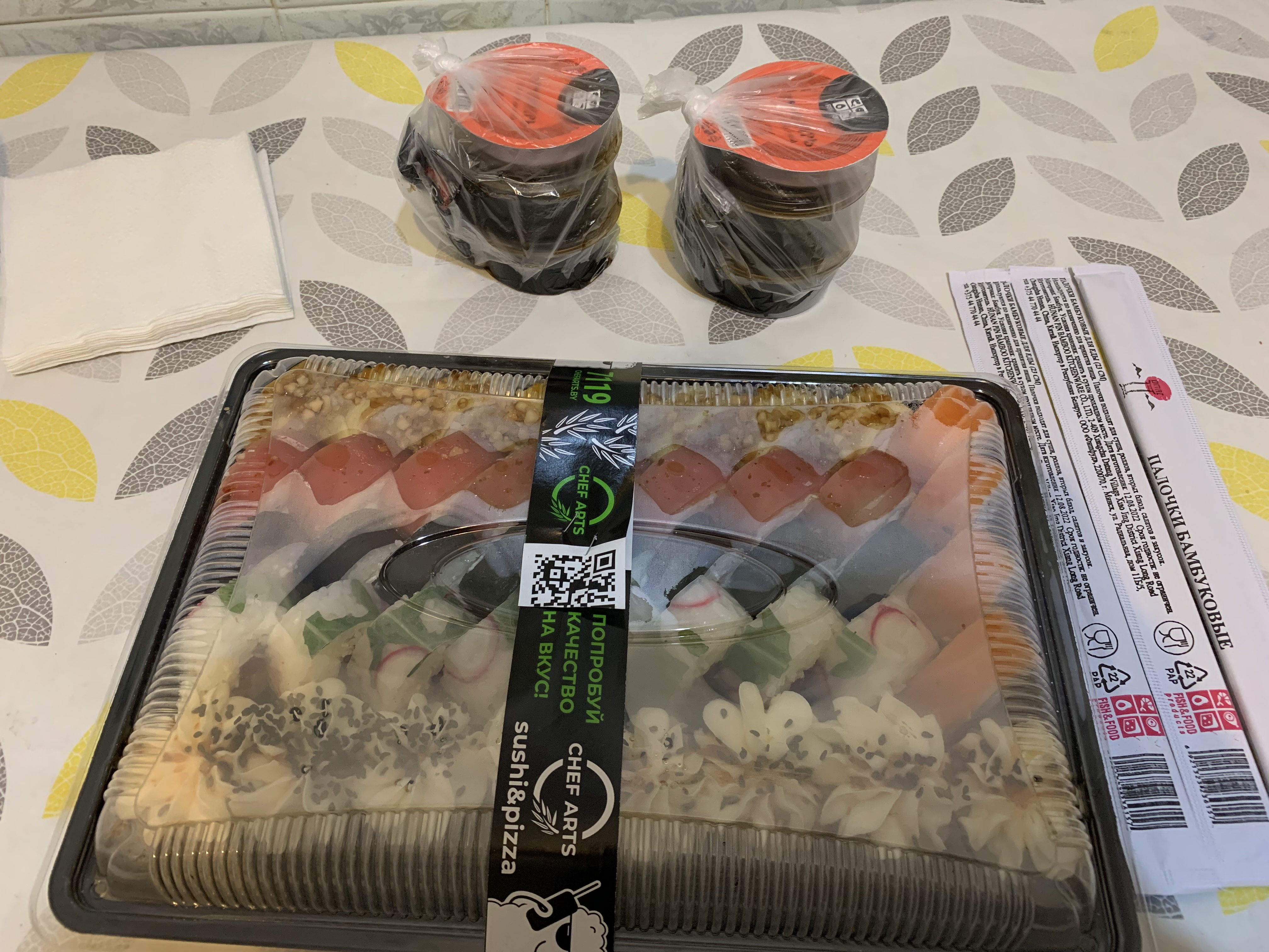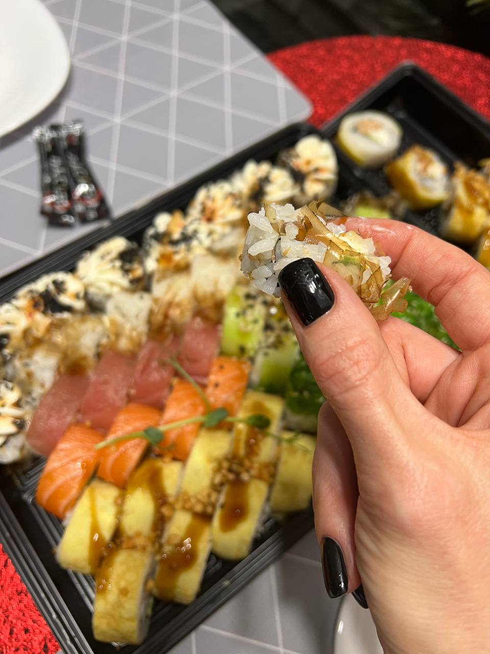 - На 1 суши-сет прилагается не более 4 комплектов палочек