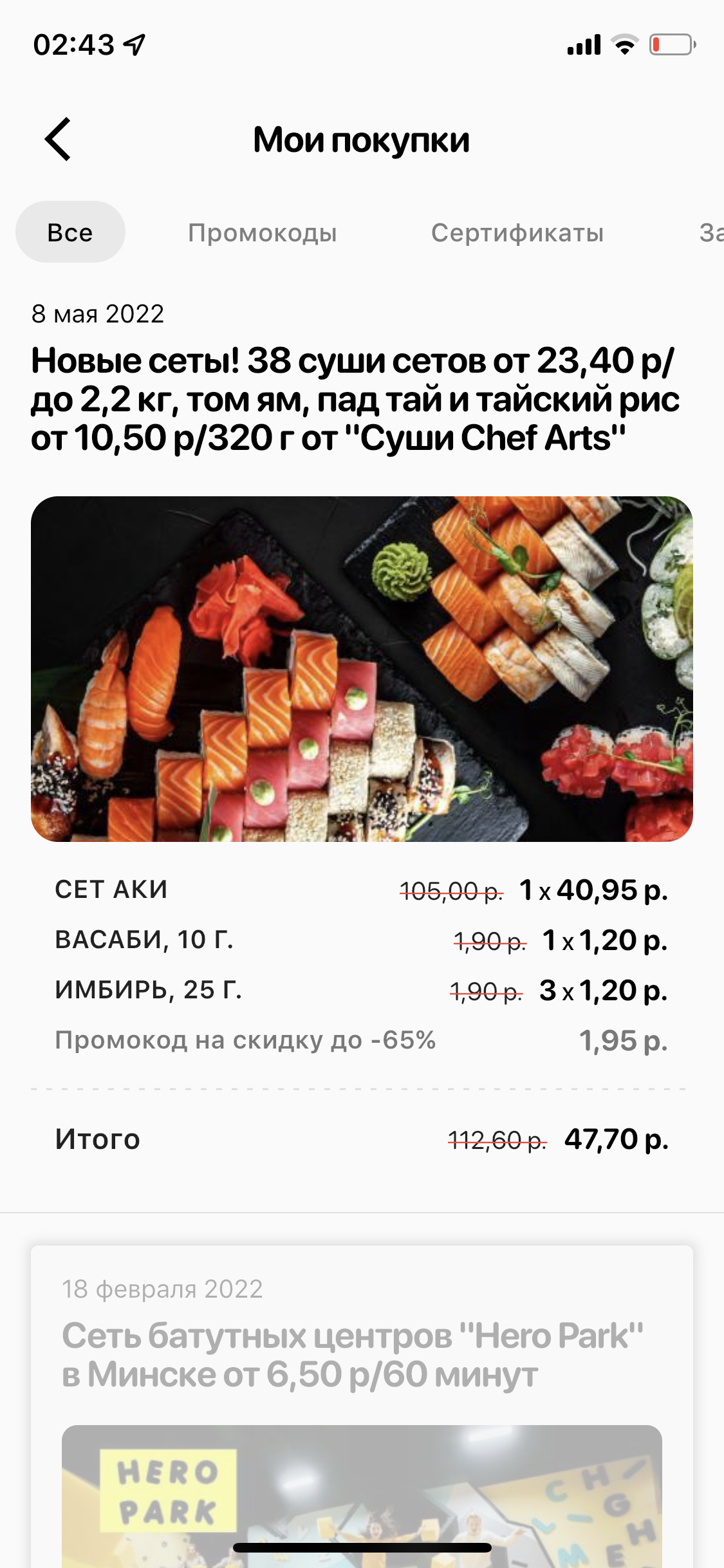 - Промокод дает право на скидку до 60% на суши-сеты от "ART FOOD"