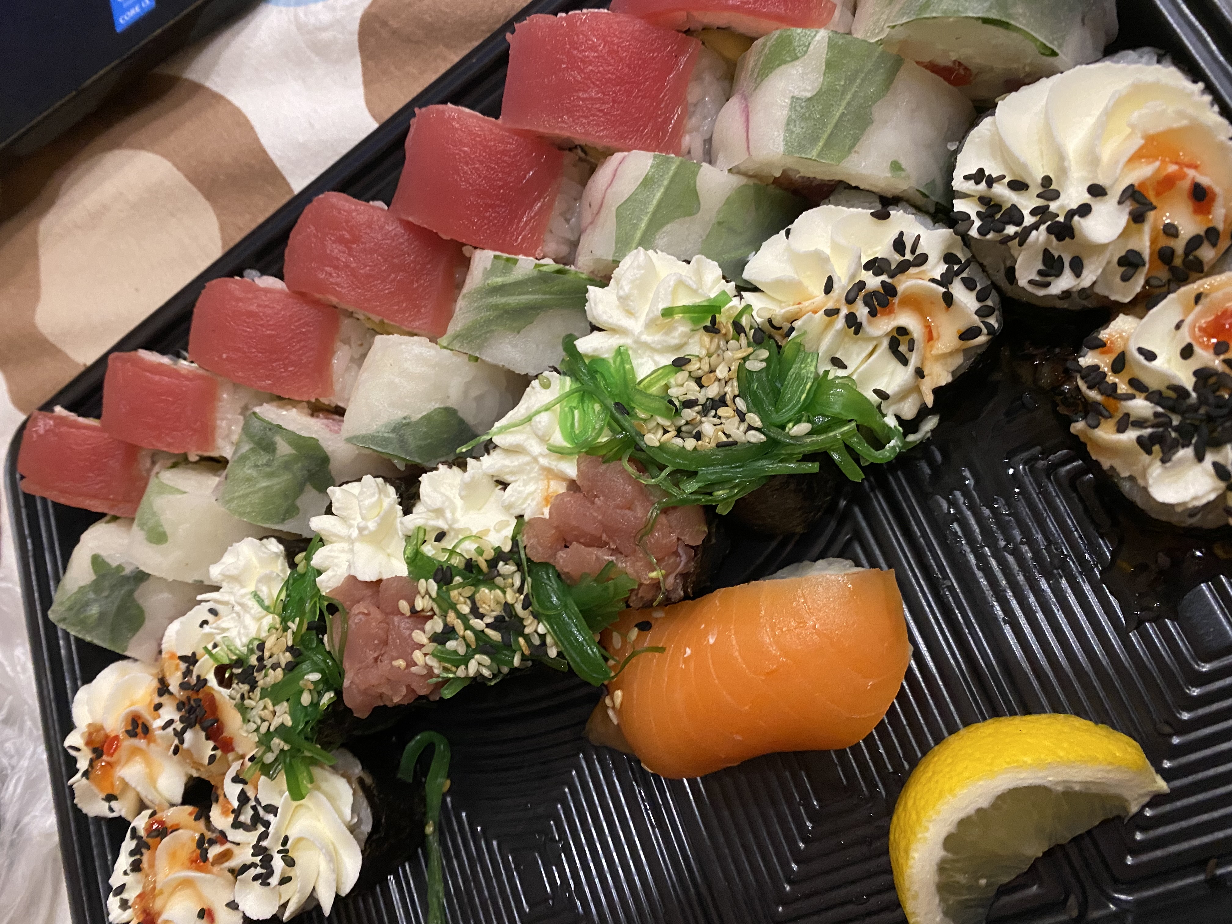 Несмотря на то, что доставку мы дождались после 12 ночи ✌️, хотели уже отменять, но колл центр уже был вне зоне доступа, ложись спать, и тут звонок - курьер. Позвонил - сказал я опоздаю на минут 20, это да, опоздание уже не на минуты, а на Часы пошли))))) не стали быть душнилами, забрали свой заказ) обычно, если делаешь заказ после 9-10 вечера, доставляют в течении 40 минут, а тут 2 часа. Странно)) А еще парень пошёл на улицу забрать заказ, не успел отвернуться, как курьер по газам дал, бедный, конечно смена то как час назад уже закончилась))) потешным парень))) вообщем не вечер, а кино) но все же суши приехали большими, вкусными, вообщем все как надо) Даже дольку лимона положили, впервые за несколько лет увидела этот сюрприз)) вообщем закрыли глаза, всякое бывает, но лучше предупреждайте гораздо заранее, ведь не каждый будет ждать до полуночи) Фото прилагаю, как ещё раз сказала душнилами не будем, мы так и продолжим заказывать у вас, не смотря на казусы🗿🗿🗿