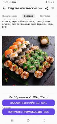 - Промокод дает право на скидку до 60% на суши-сеты от "ART FOOD"