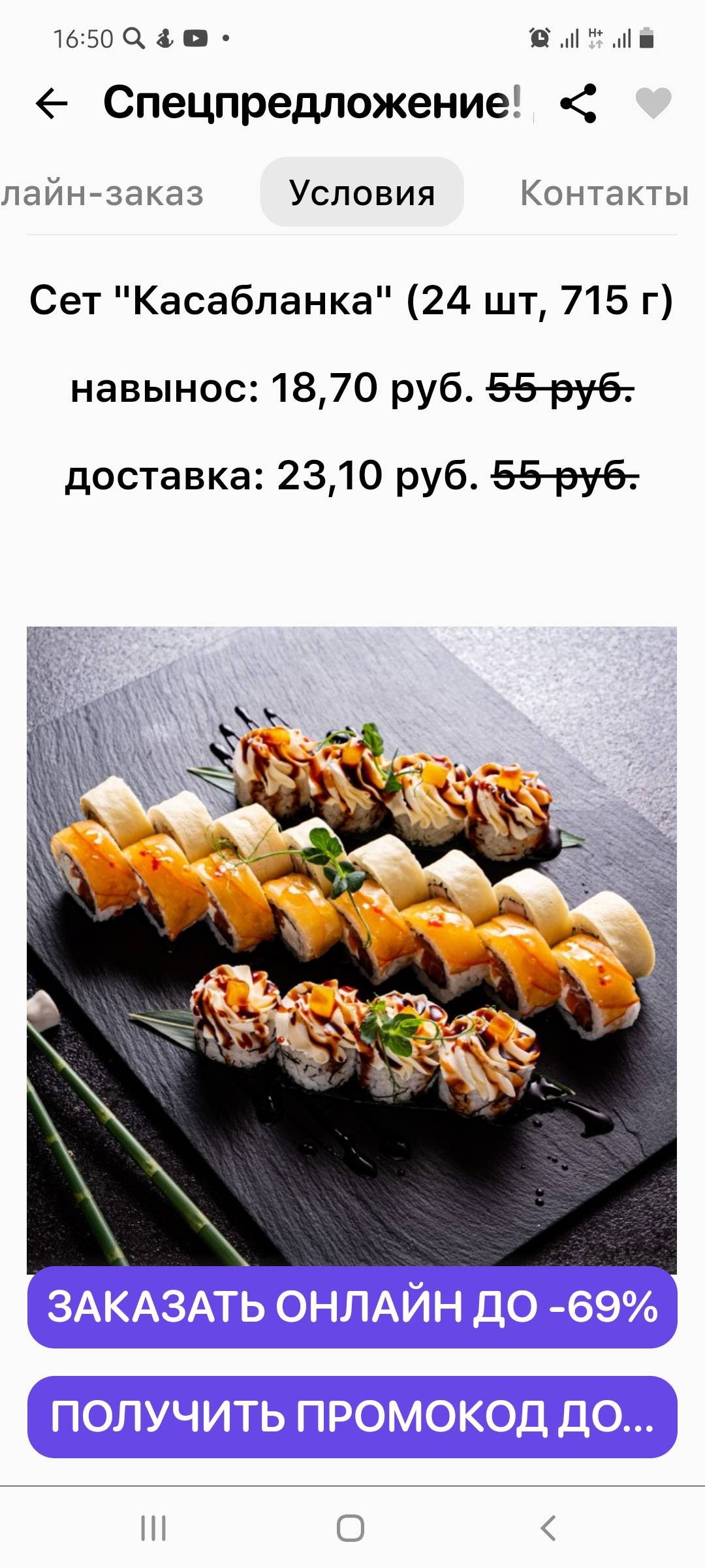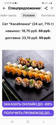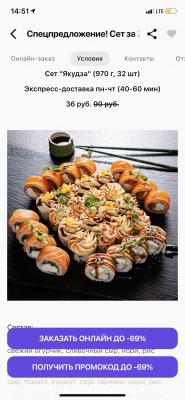 - Промокод дает право на скидку до 60% на суши-сеты от "ART FOOD"