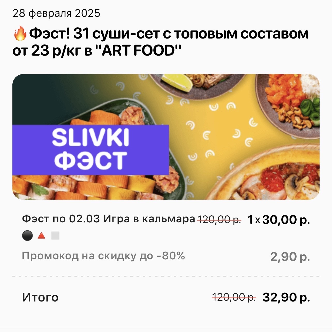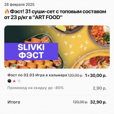 - Промокод дает право на скидку до 60% на суши-сеты от "ART FOOD"