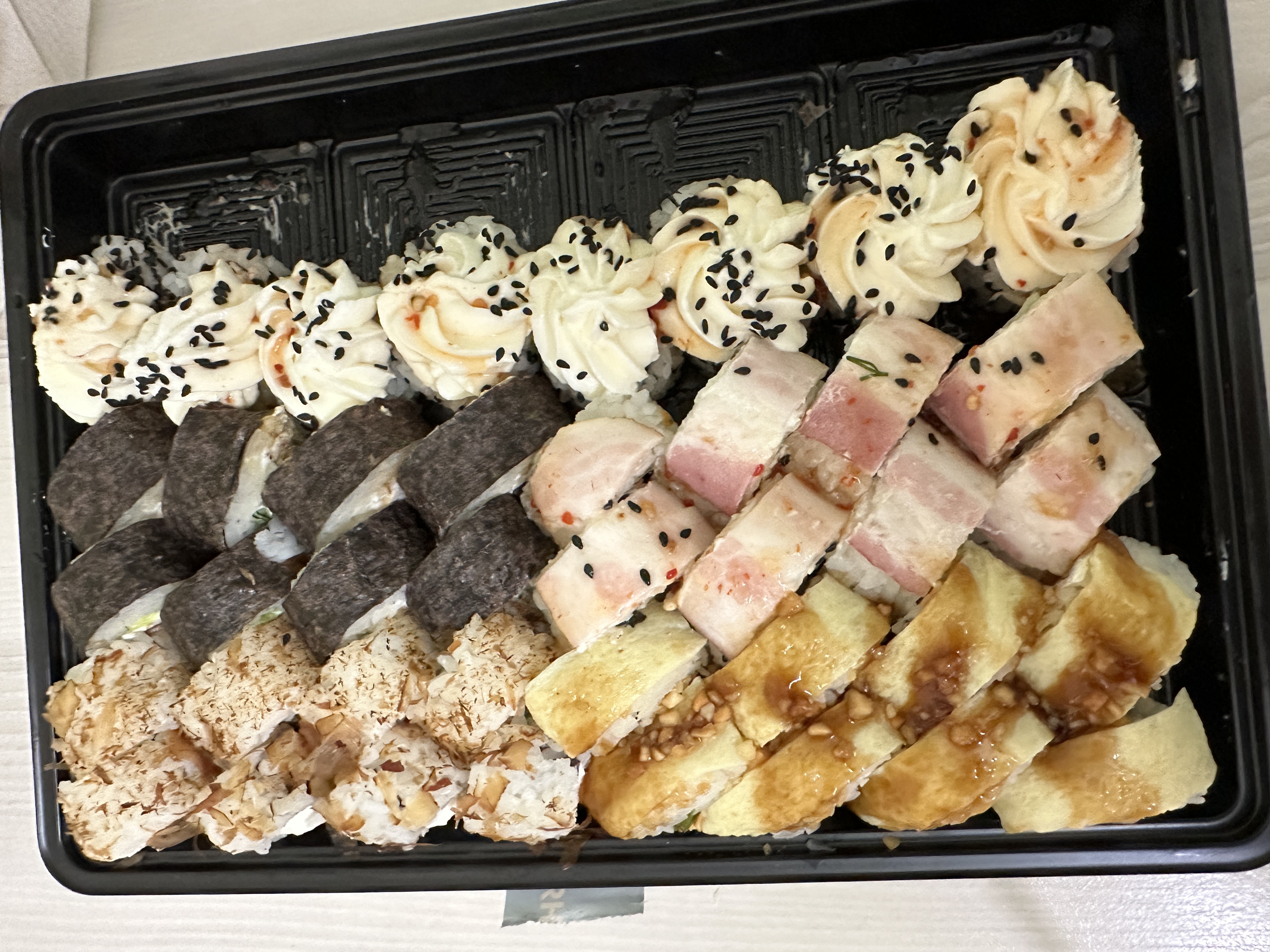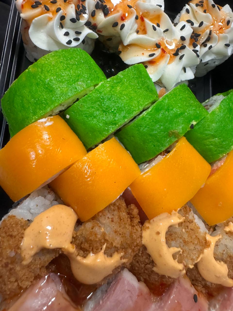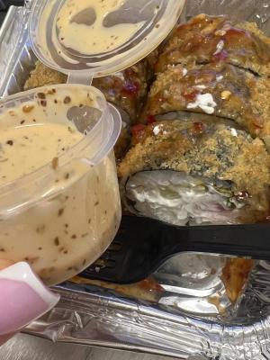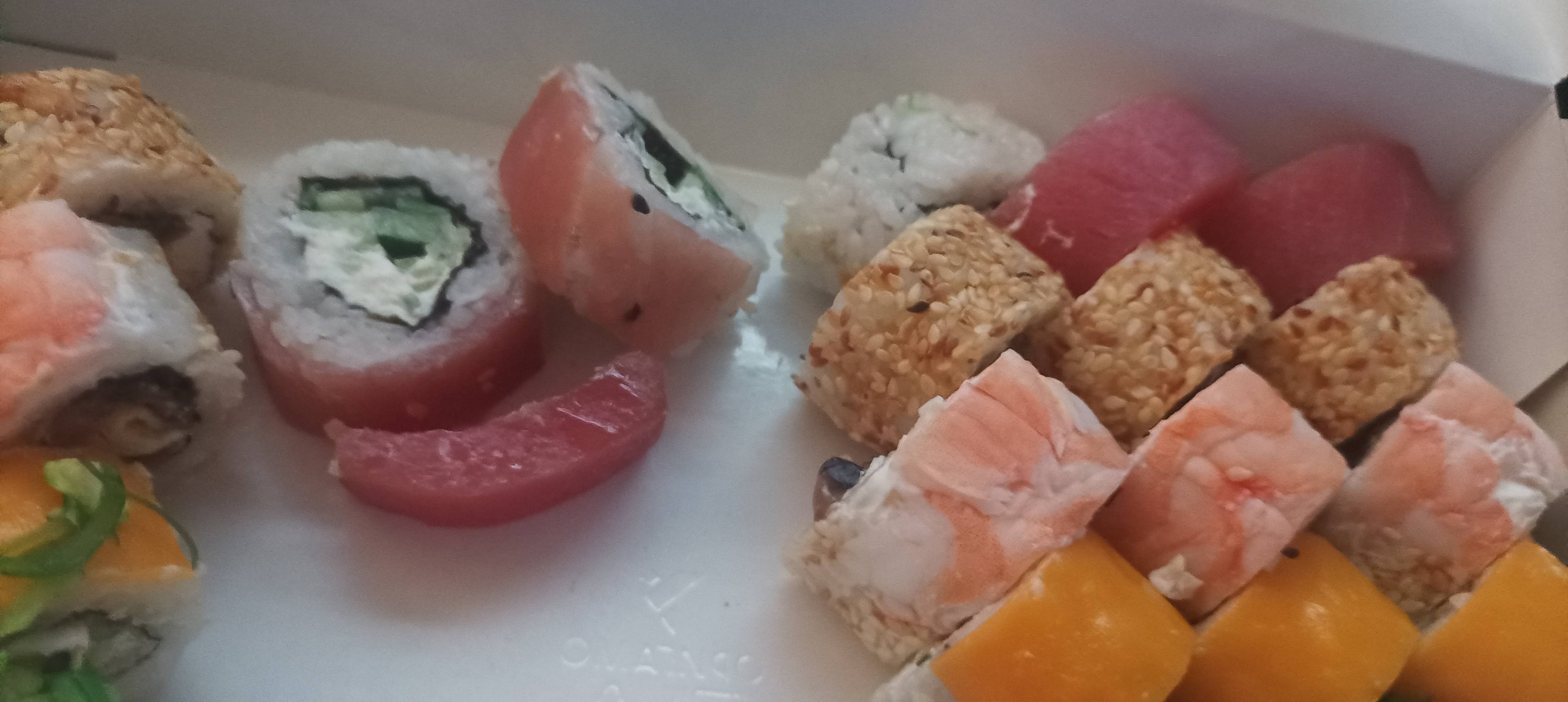 Суши пришли ещё даже теплые, а значит свежие ! Нежные роллы, всегда заказываю их. С соусом кунжутным вообще здорово 🙌