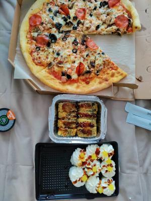 Обычно заказываем только роллы, в этот раз решили попробовать и пиццу. Все пришло в прекрасном виде, и даже раньше по времени. Невероятно вкусная и пицца, и роллы!