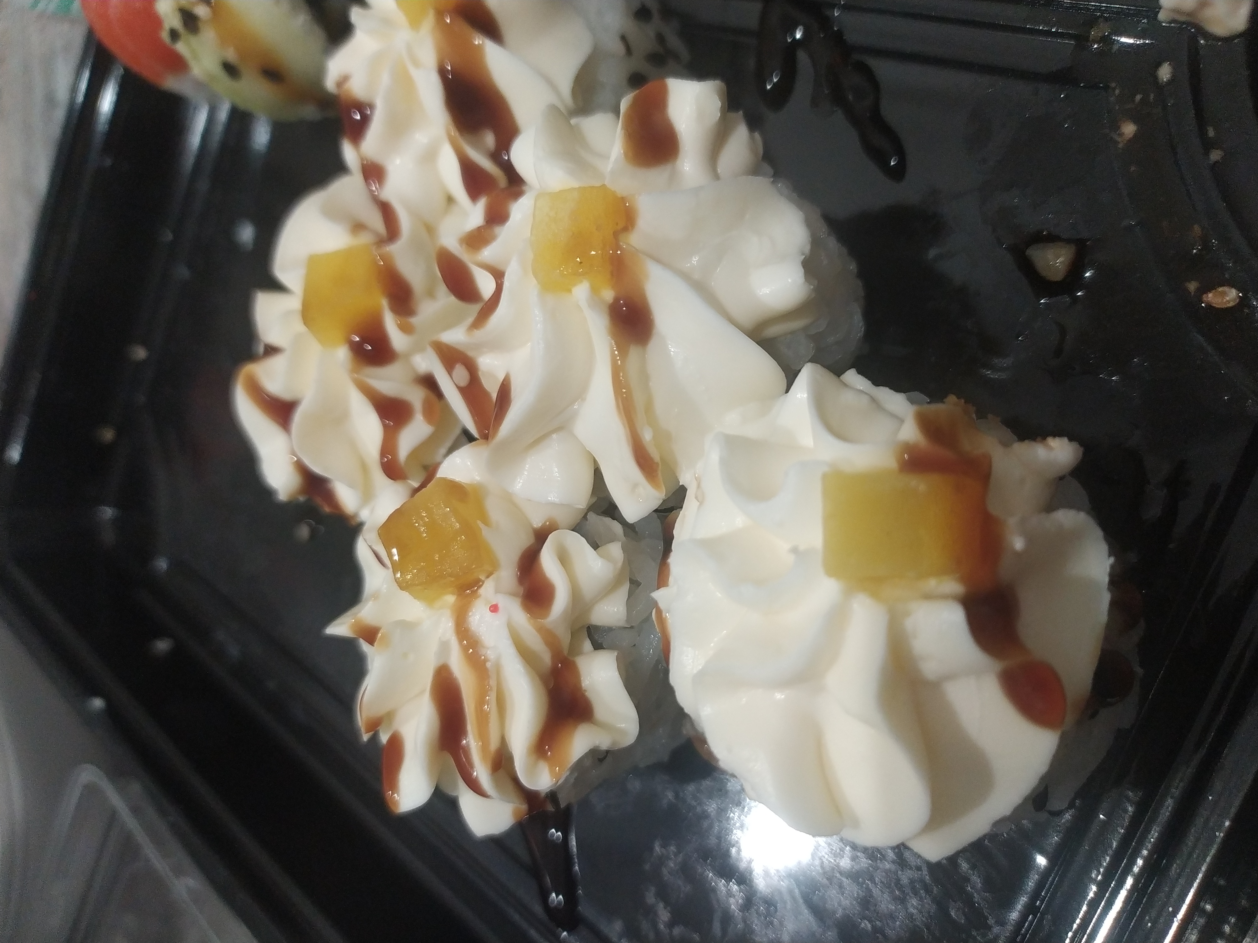 Состав: креветка тигровая в темпуре, сыр сливочный, сыр чеддер, соус терияки, нори, рис