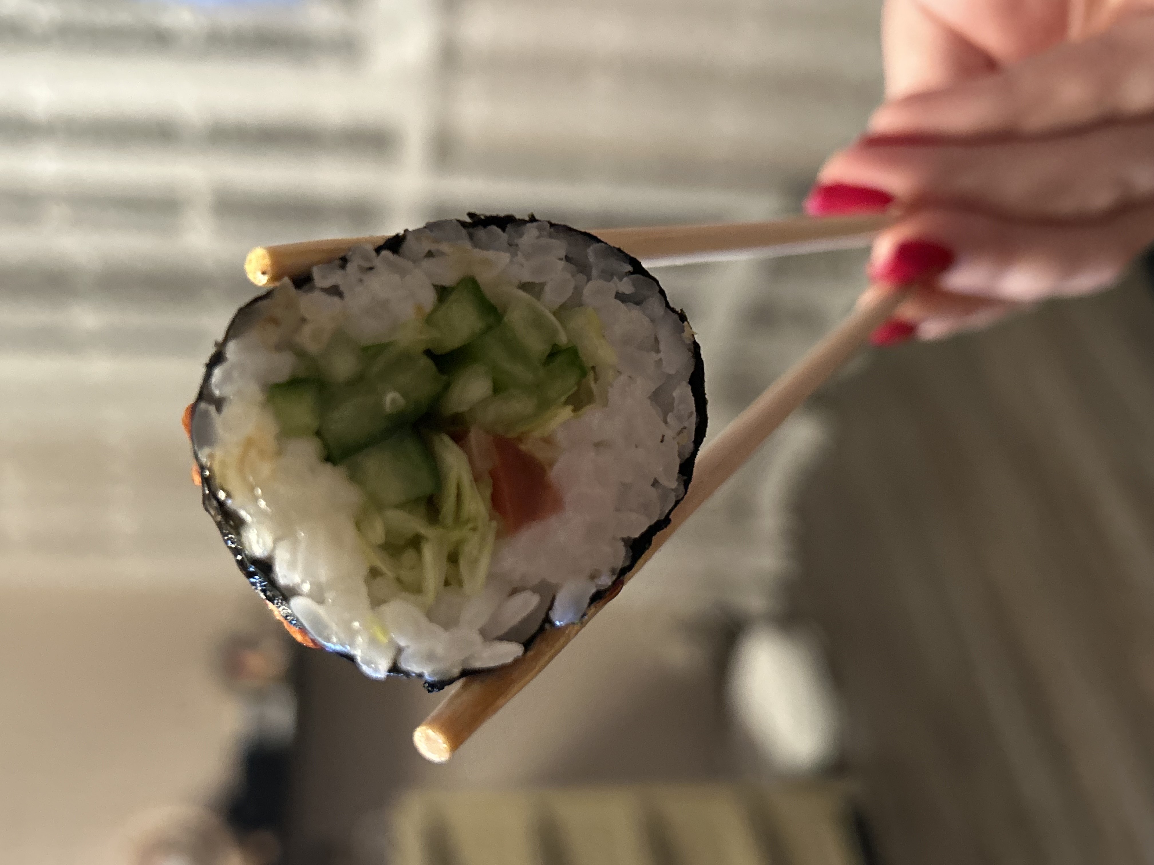 Состав: филе лосося, огурец, сыр, рис, нори