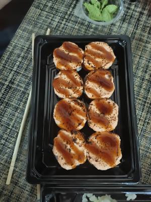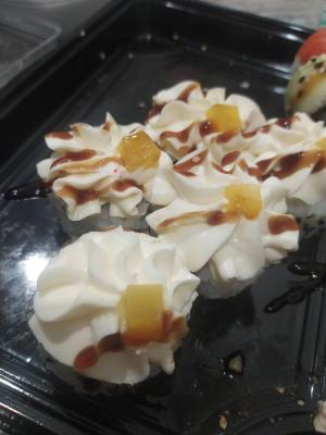 Состав: грудка цыпленка подкопченная, салат айсберг, крем-чиз, том-ям, такуан, рисовая бумага