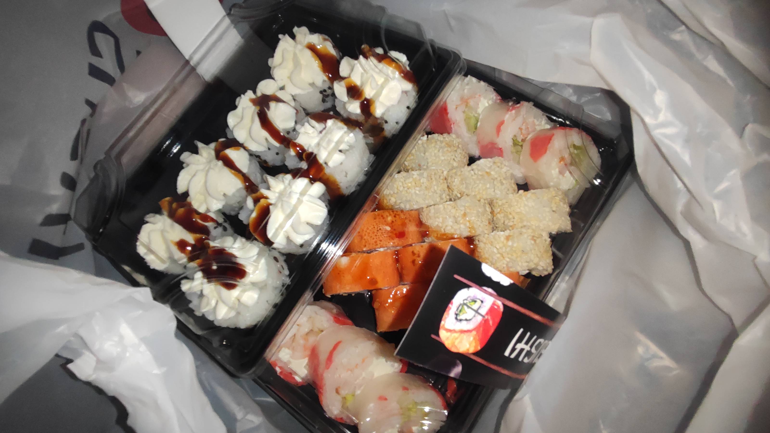 - гарнир: имбирь (40 г), соевый соус (40 мл), васаби (15 г) в подарок!