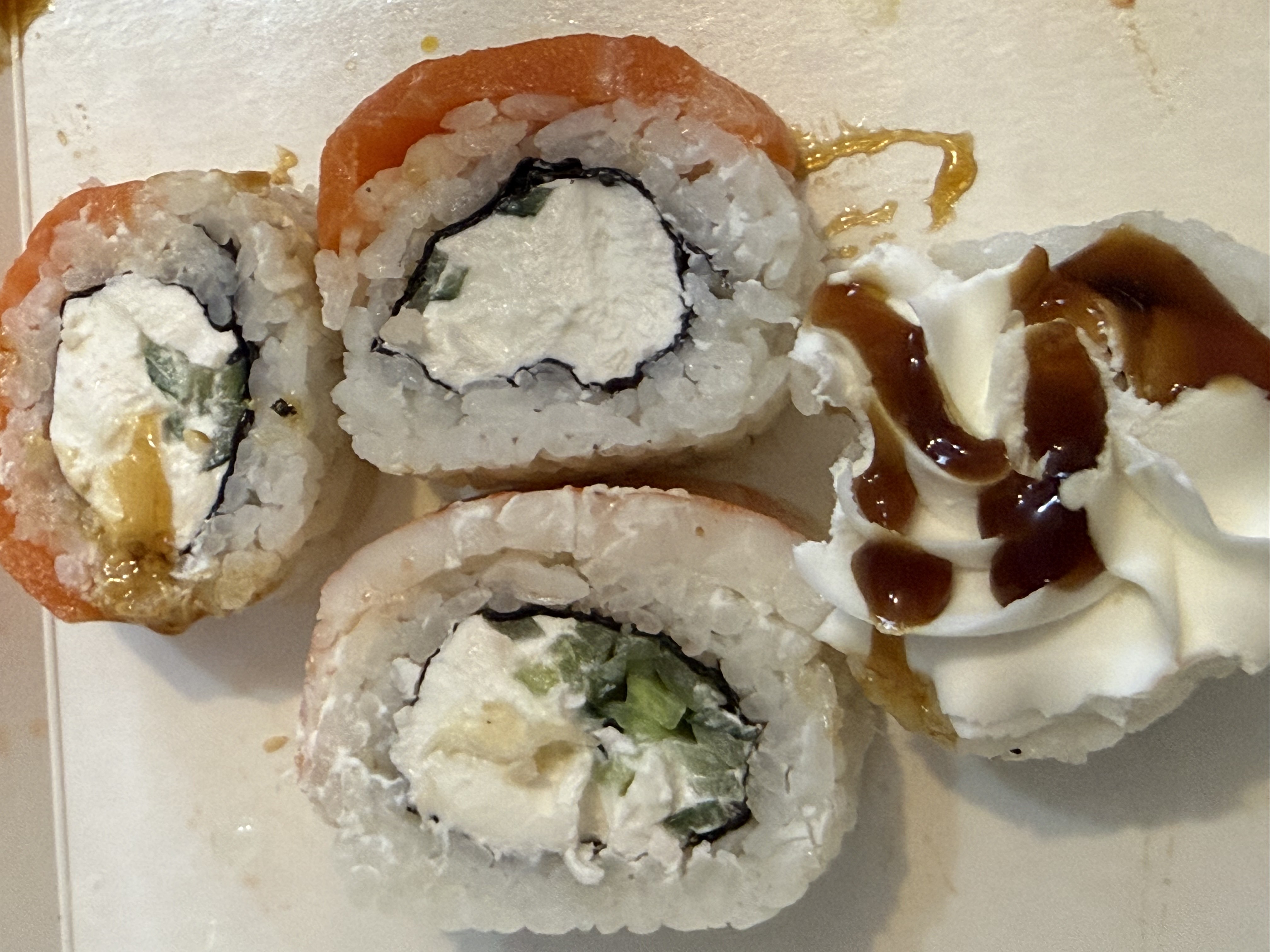 - В теплых ролла крайние кусочки отдаются запечатанными, так как большинству нравится дополнительная панировка на роллах!